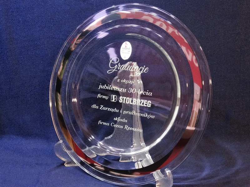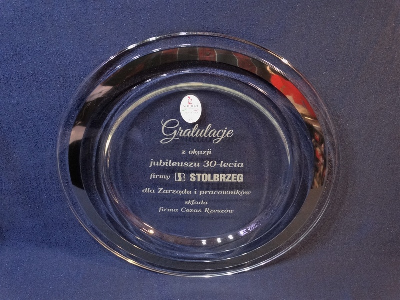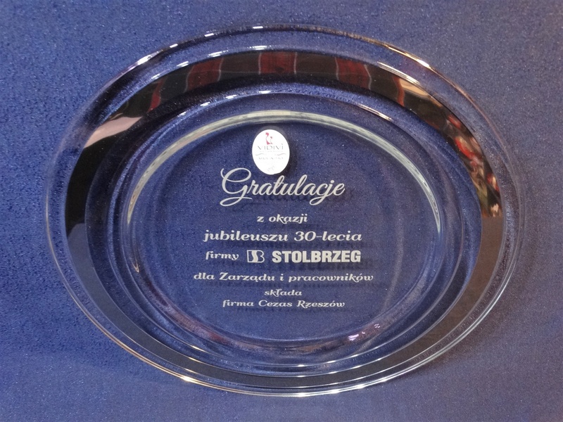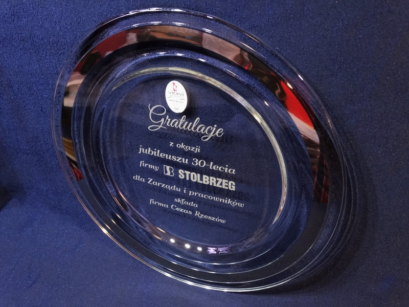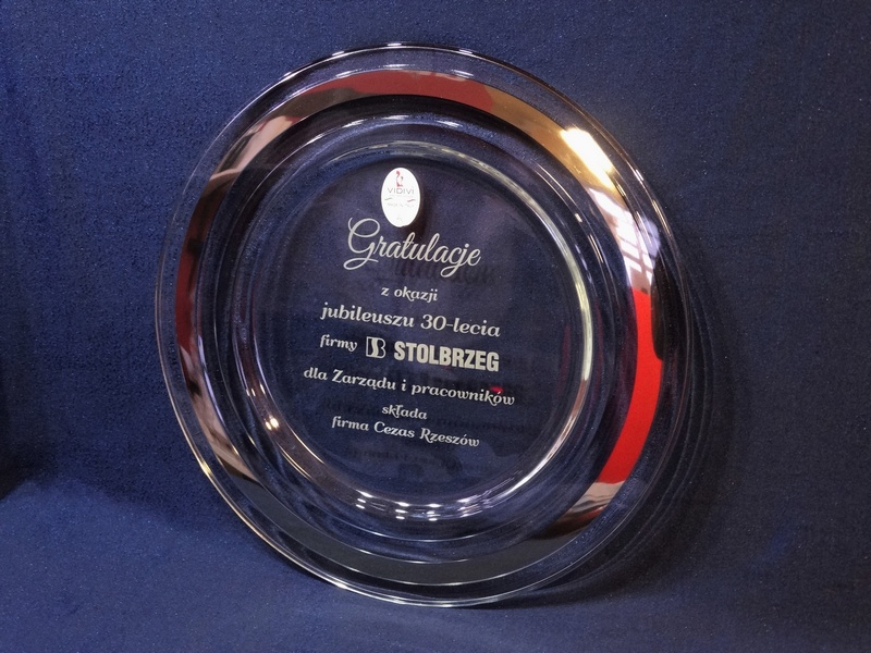 Usługa grawerowania na szklanej paterze.
