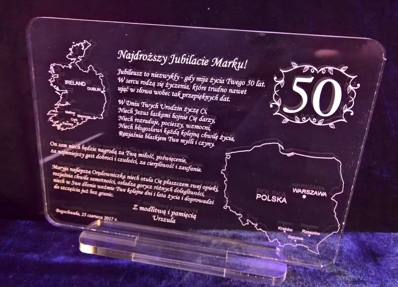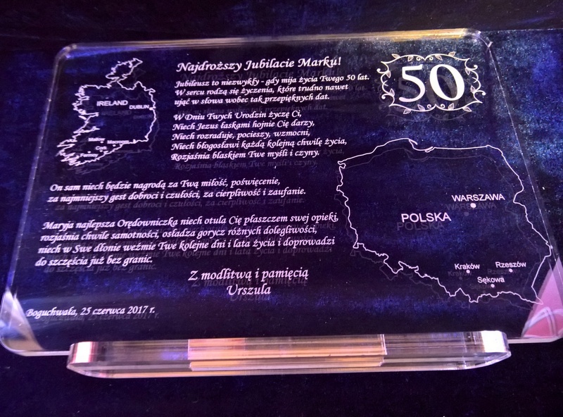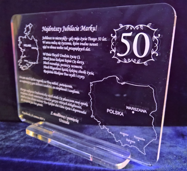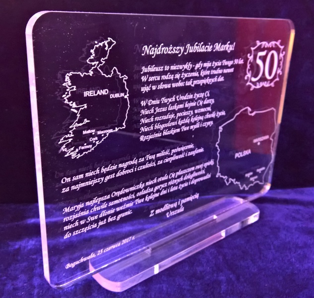 Grawer wykonany jest laserowo na bezbarwnej płycie pleksiglasu.