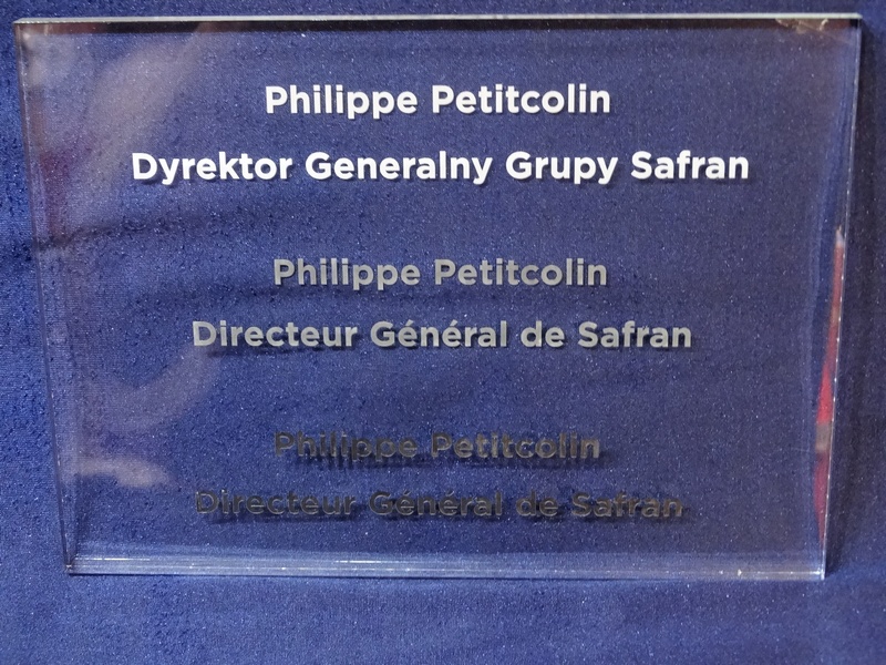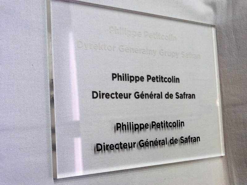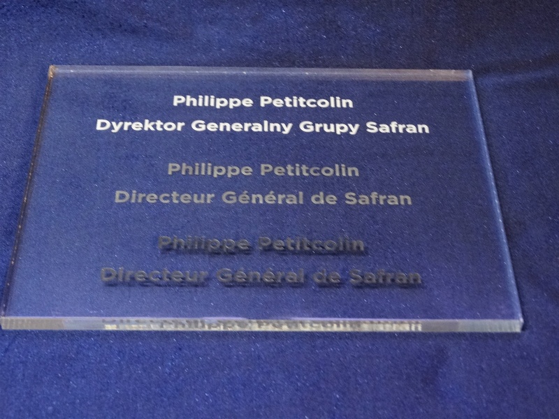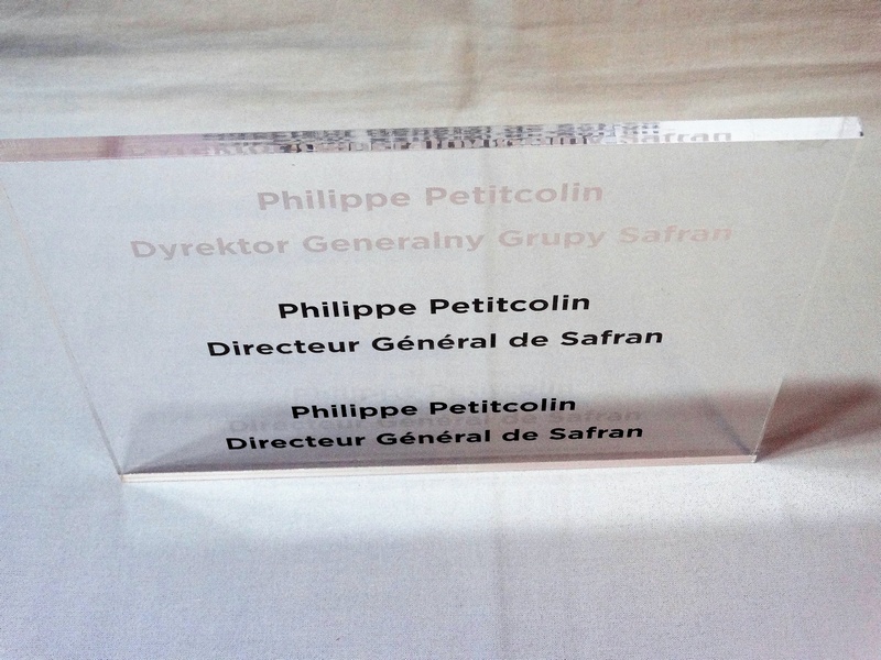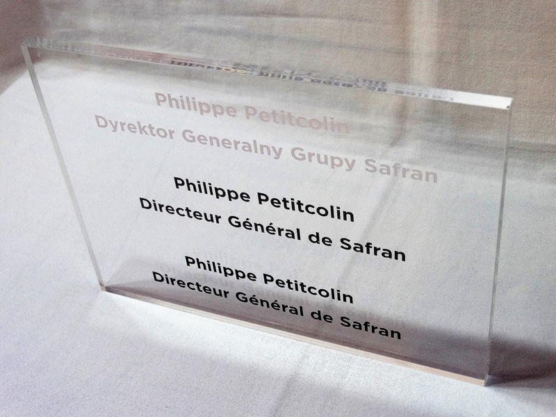 Grawer w pleksi bezbarwnej jest wypalony na biały kolor odcina się od bezbarwnego przezroczystego tła.