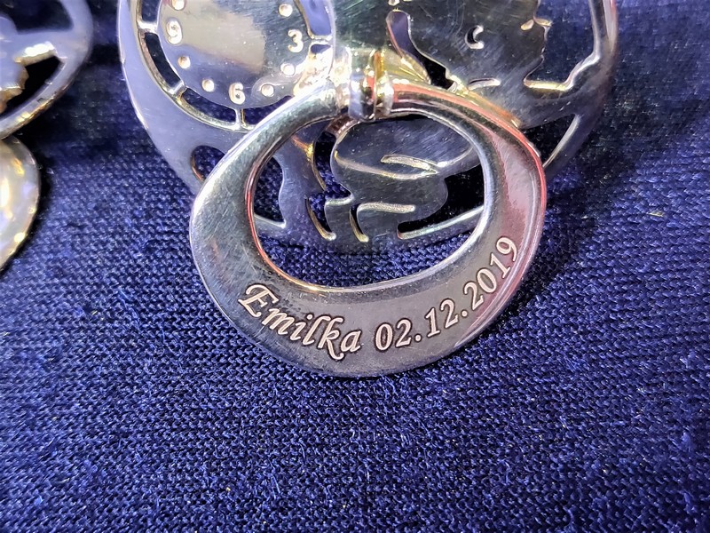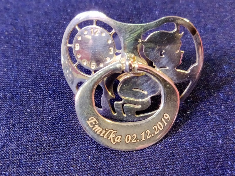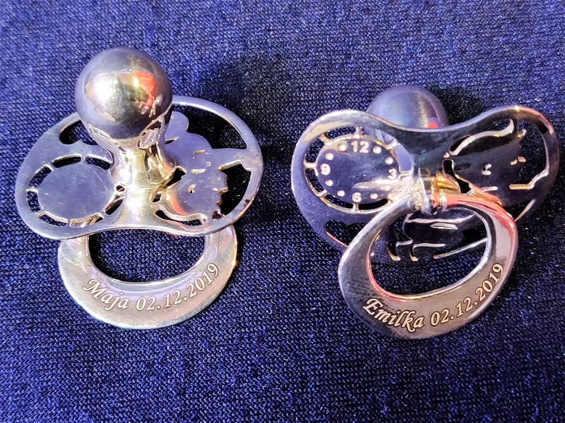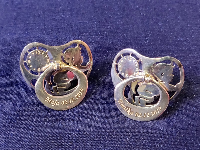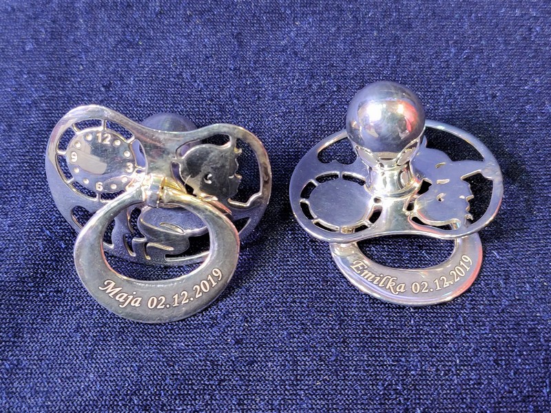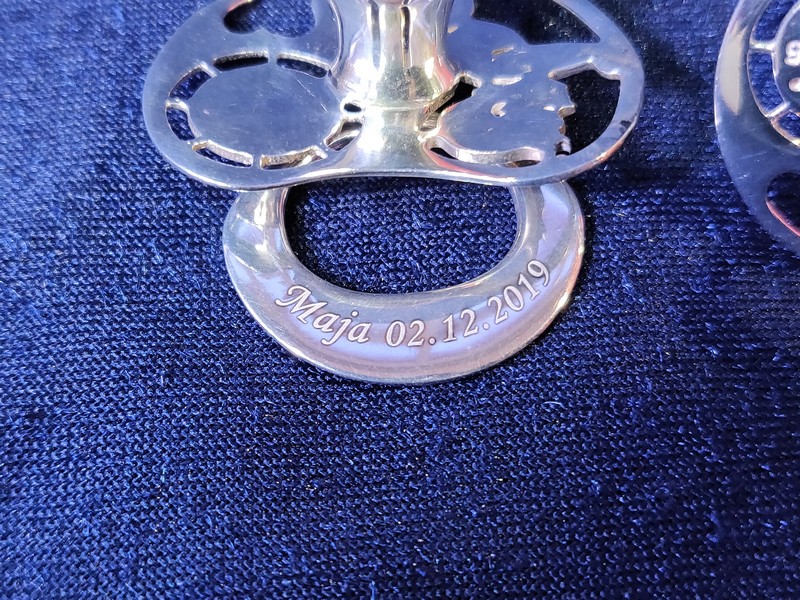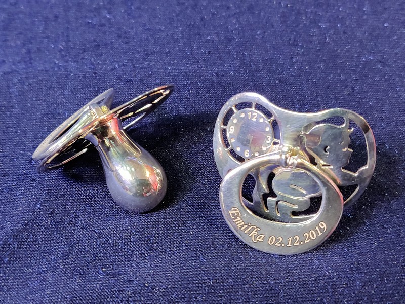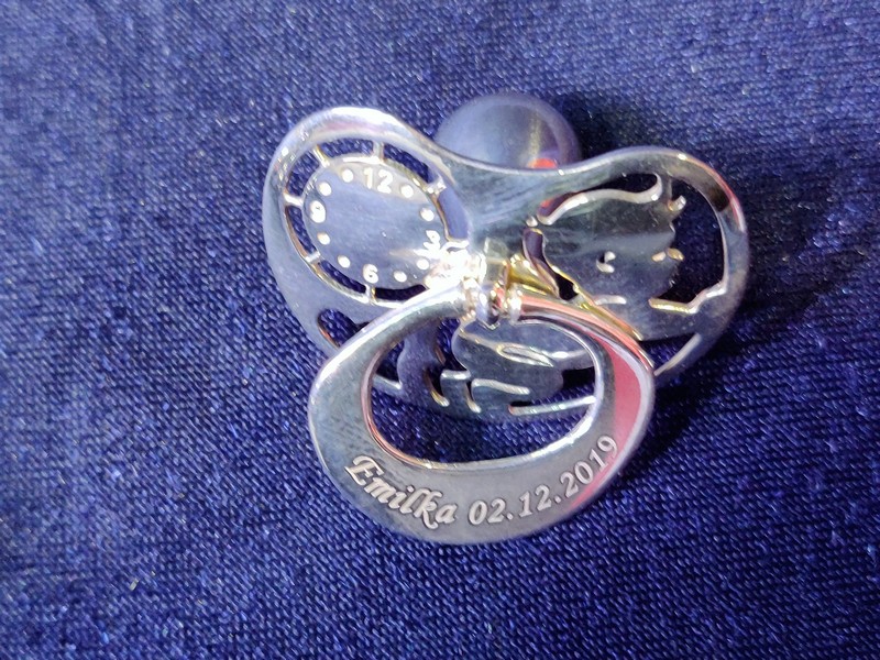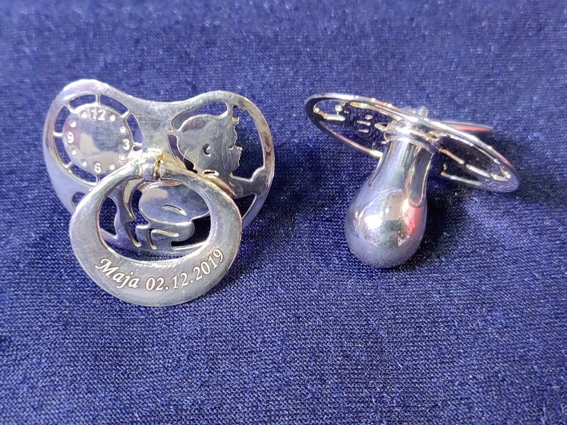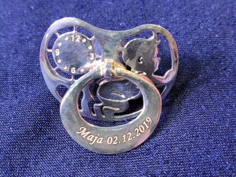 Usługa grawerowania srebrnego pamiątkowego smoczka.