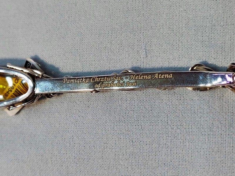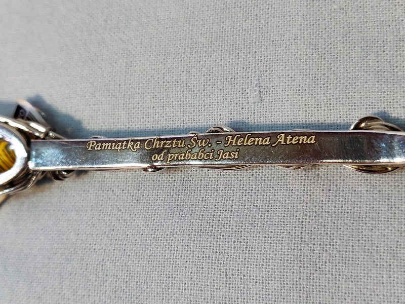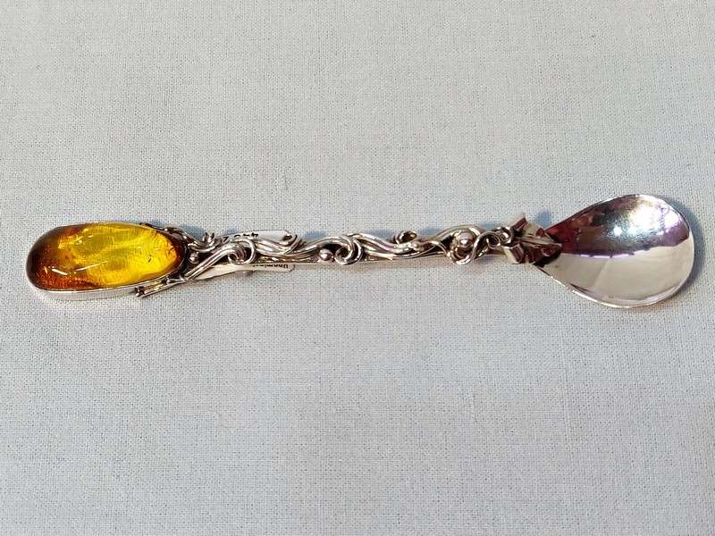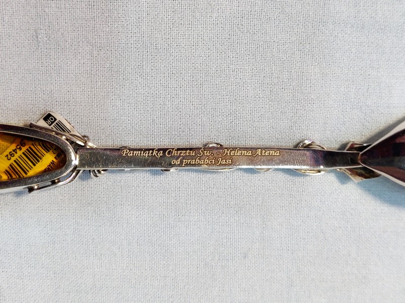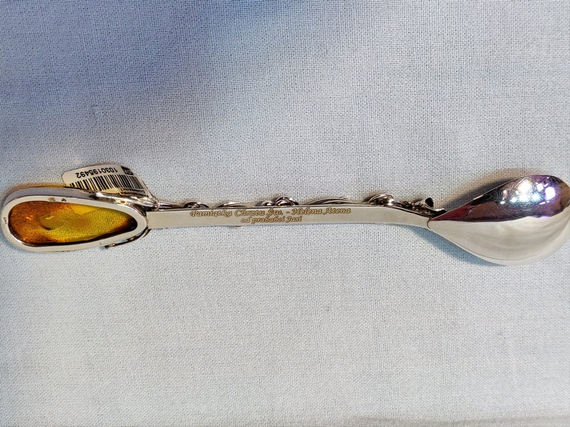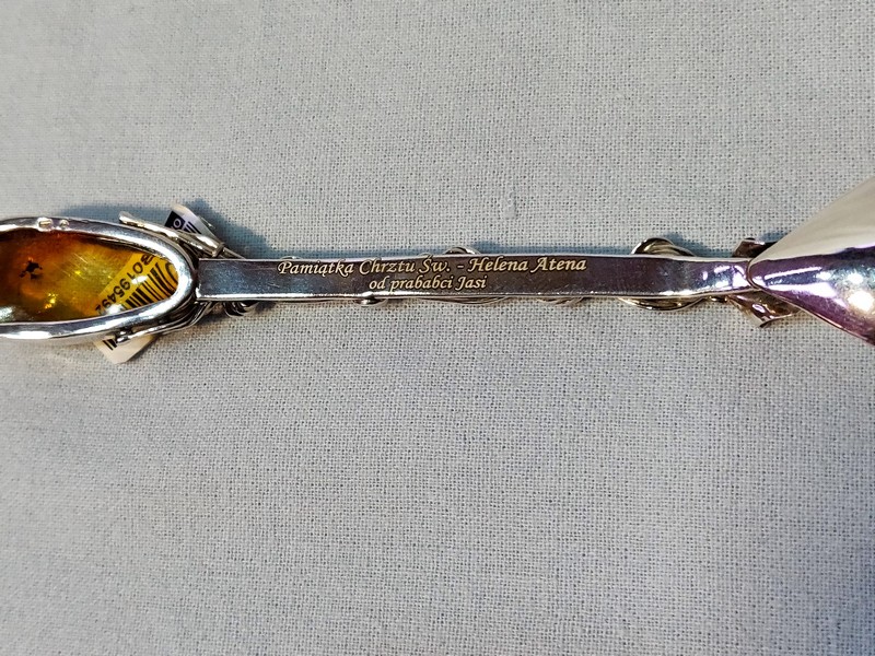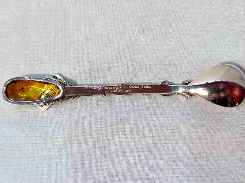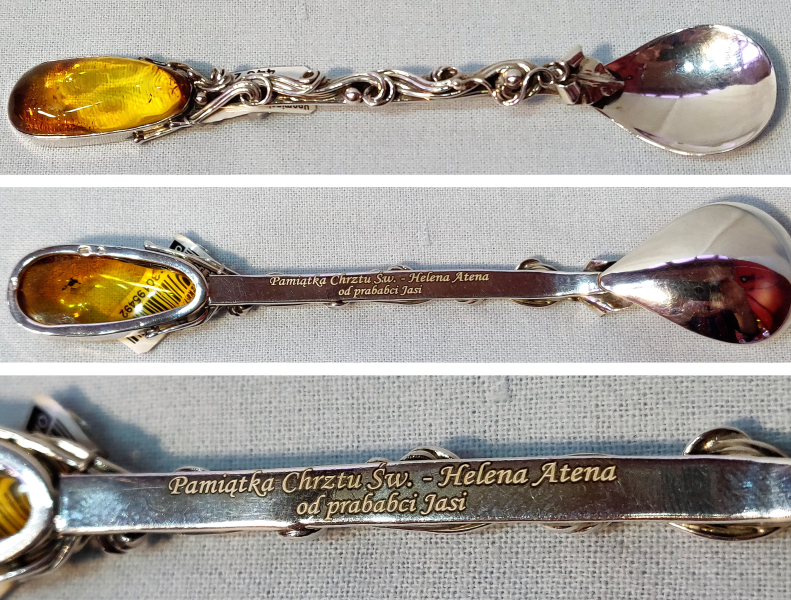 Usługa grawerowania ozdobnej srebrnej pamiatkowej łyżeczki z bursztynem.