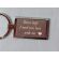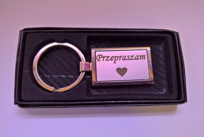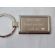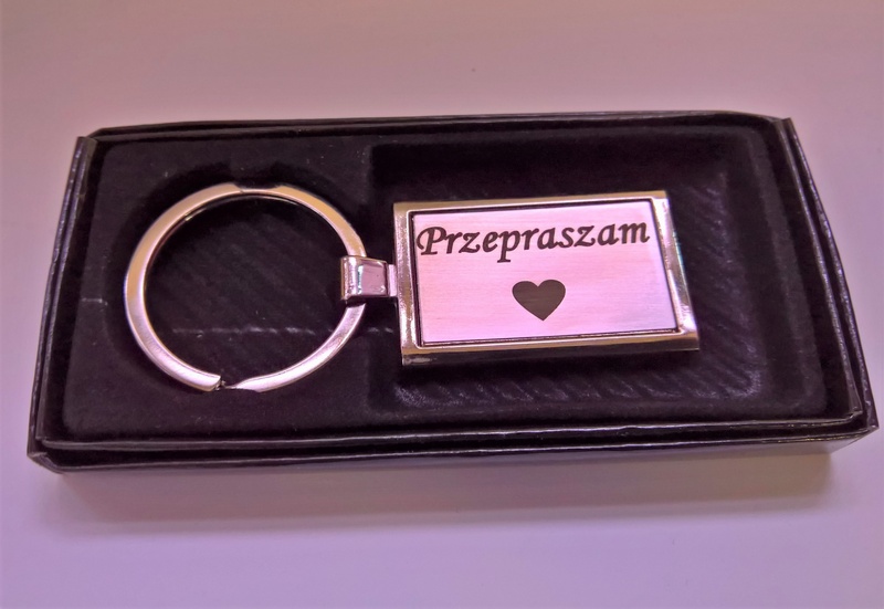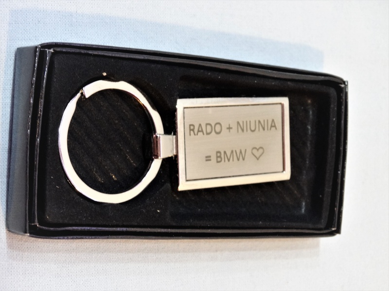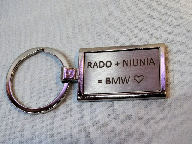 Usługa grawerowania pamiątkowego metalowego breloczka o prostokątnym kształcie.