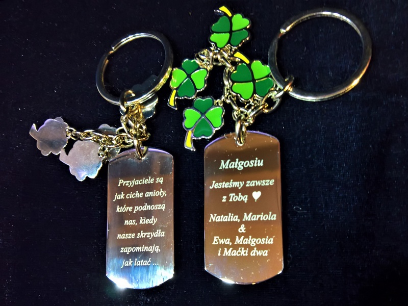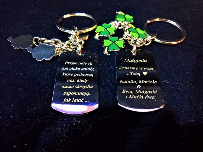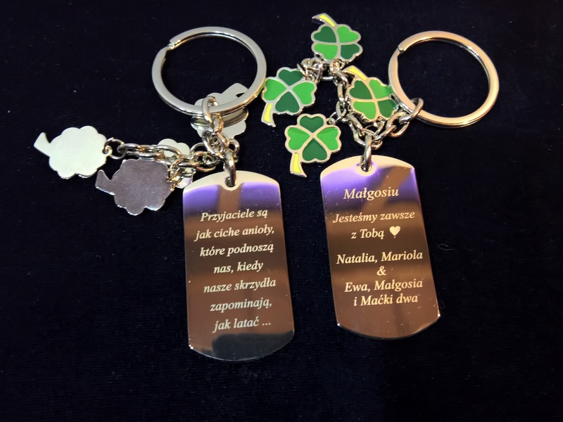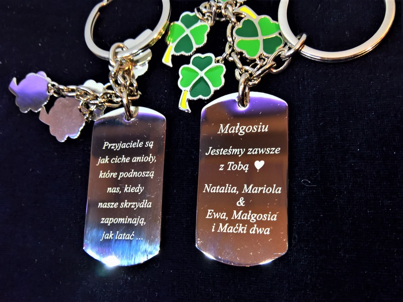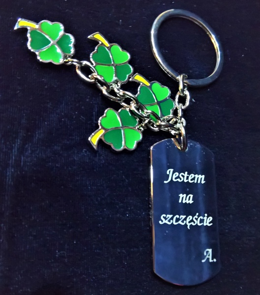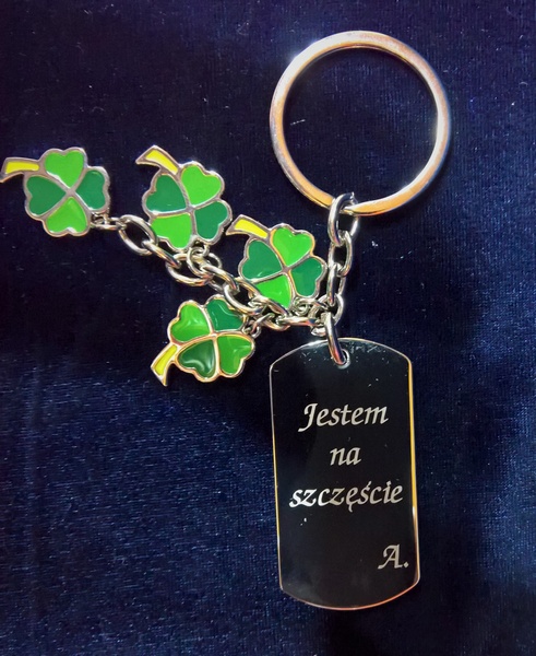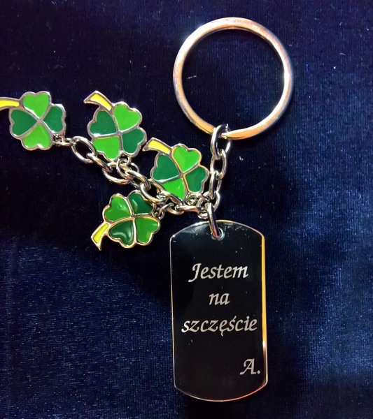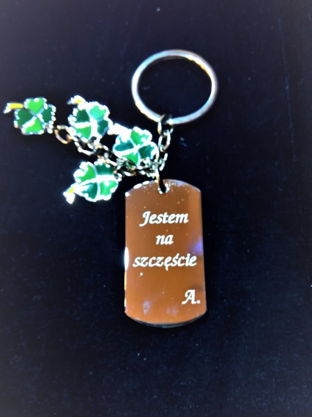 Usługa grawerowania pamiątkowego metalowego breloczka w kształcie przywieszki - nieśmiertelnika z koniczynkami.
