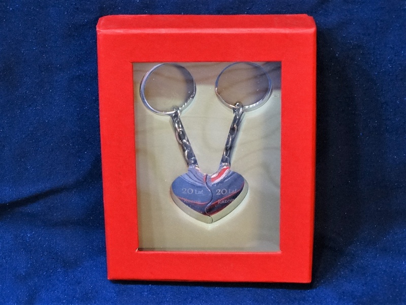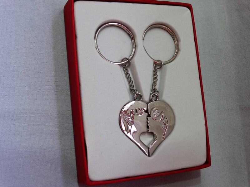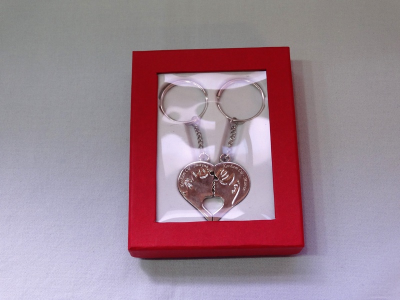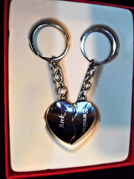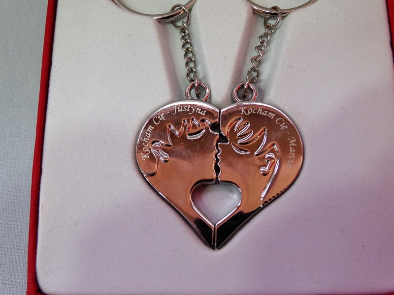 Usługa grawerowania pamiątkowego podwójnego metalowego breloczka w formie łamanego serca.