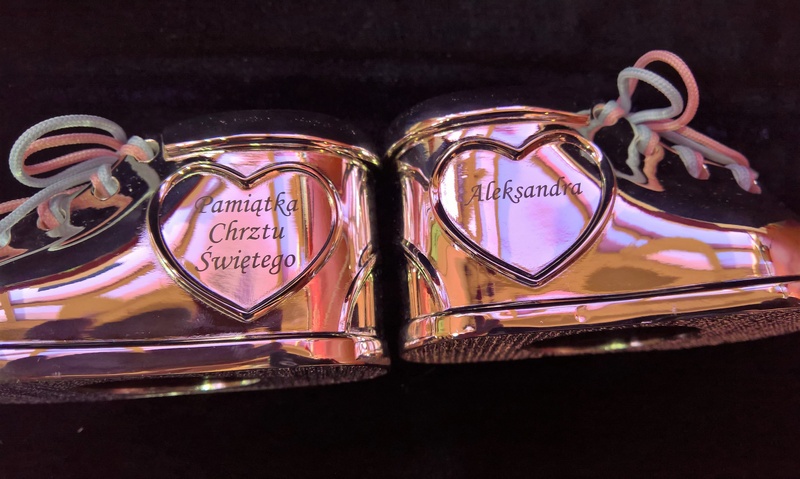 Usługa grawerowania pamiątkowych metalowych bucików.