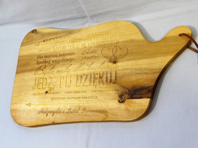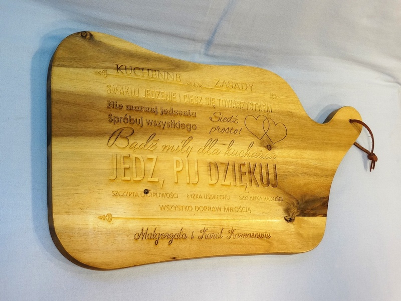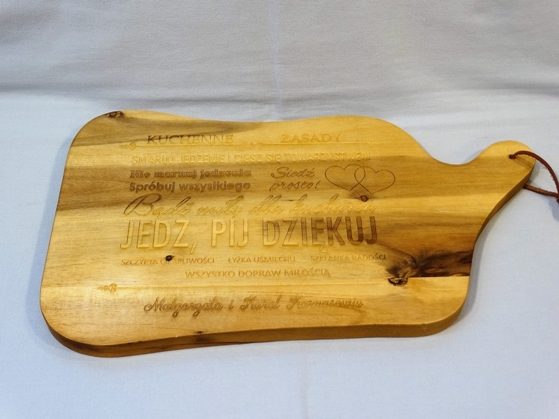 Usługa grawerowania pamiątkowej drewnianej deski kuchennej.