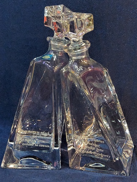 Usługa grawerowania kompletu pamiątkowych kryształowych skręcanych karafek Bohemia Lovers.