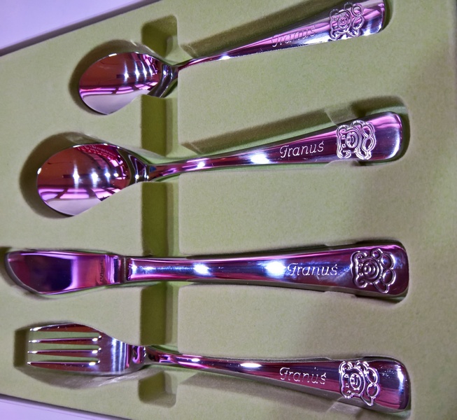 Grawer wykonany jest laserowo lub mechanicznie na łyżeczce, łyżce, widelcu i nożu - tworzących komplet.