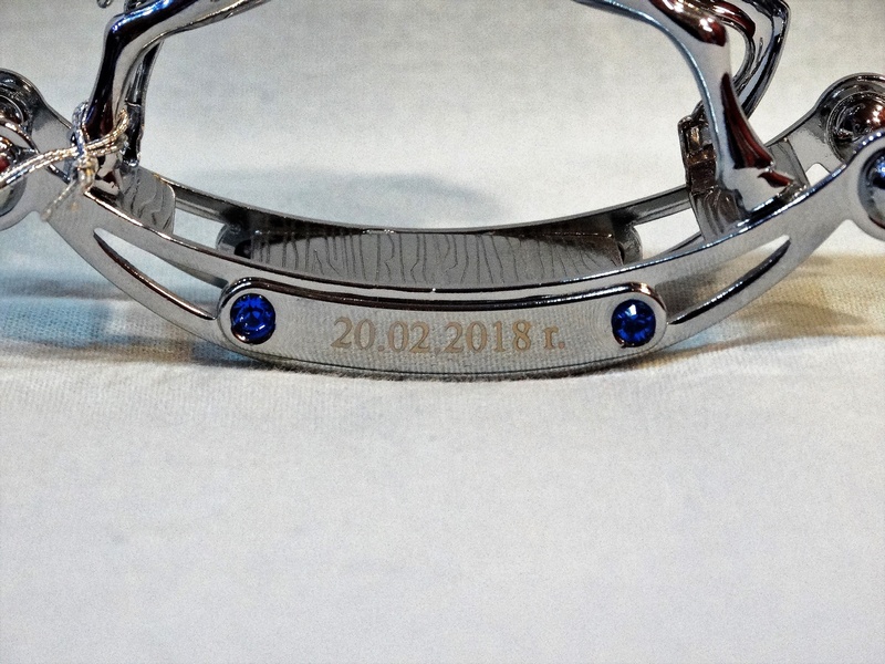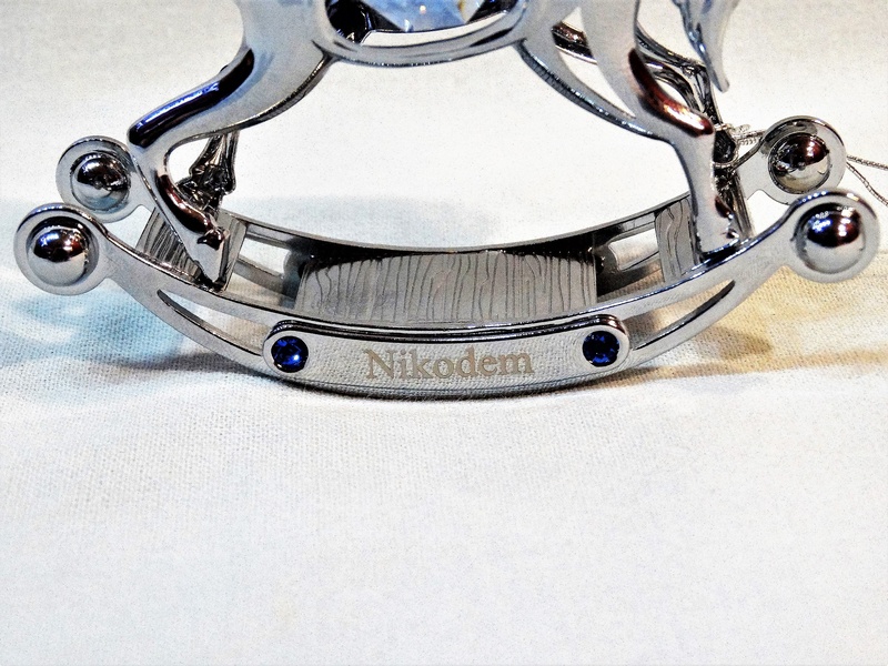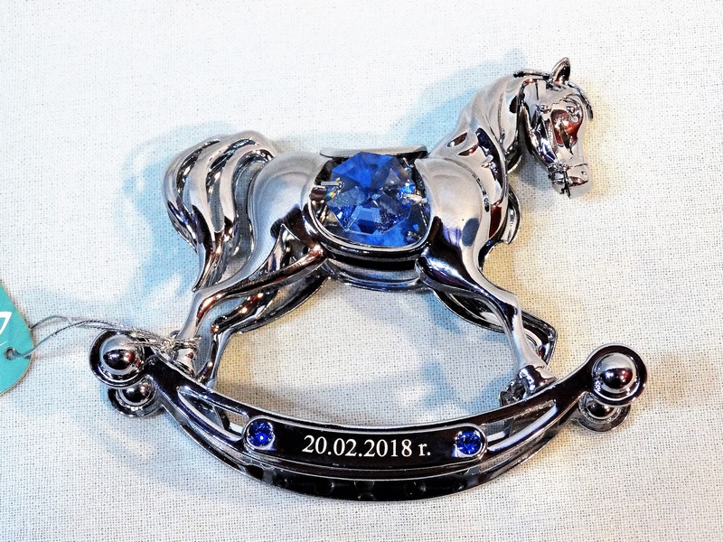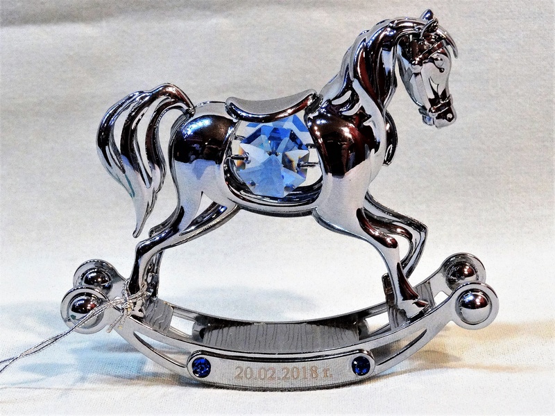 Usługa grawerowania małego chromowanego konika na biegunach z kryształkiem.