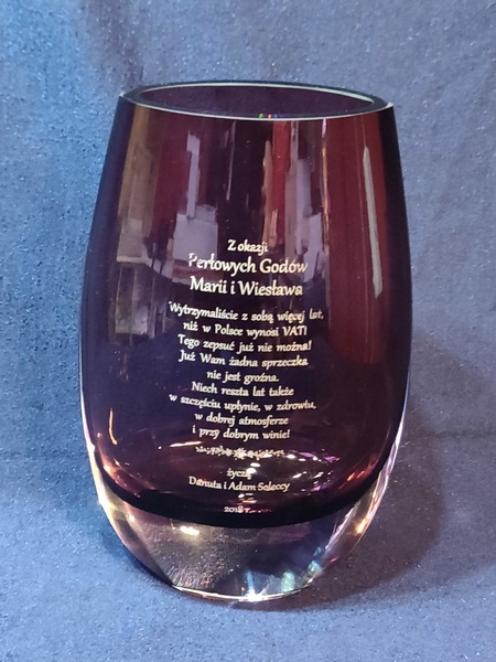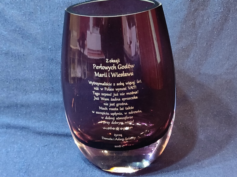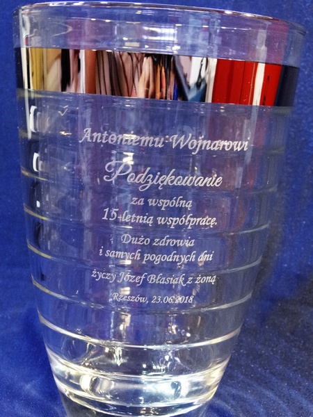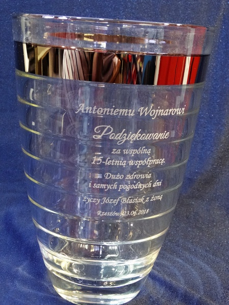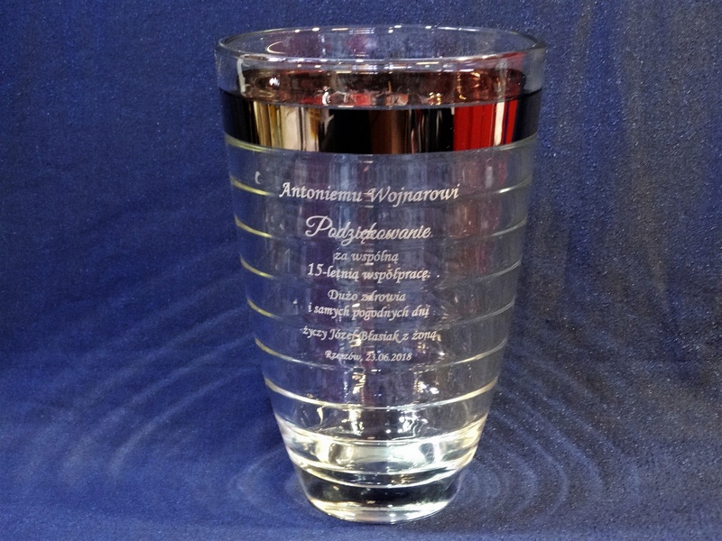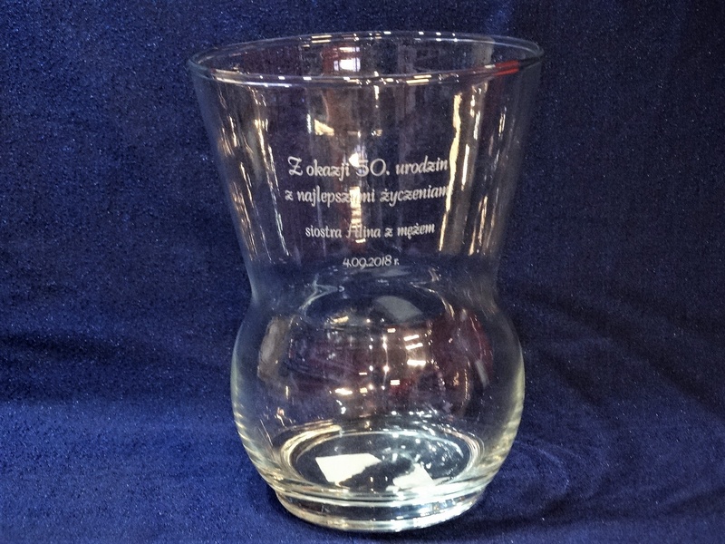 Usługa grawerowania pamiątkowego szklanego okrągłego wazonu.