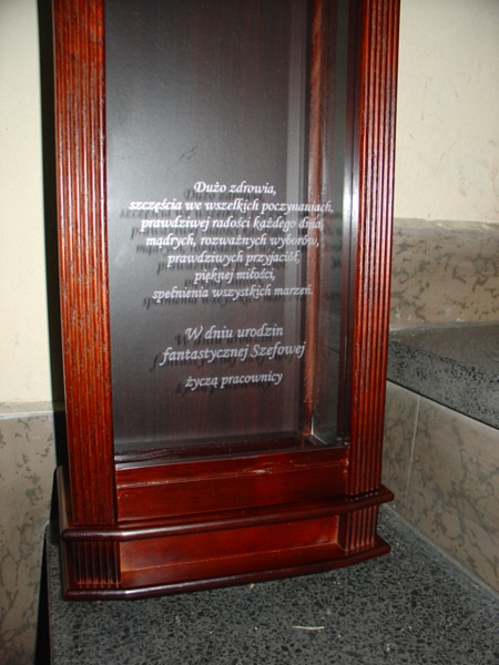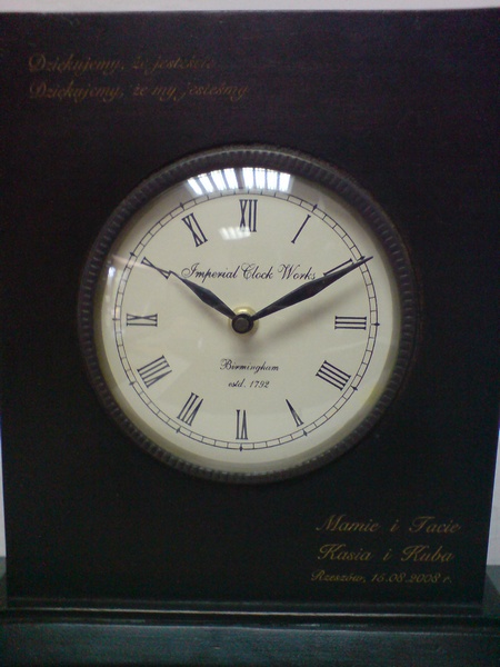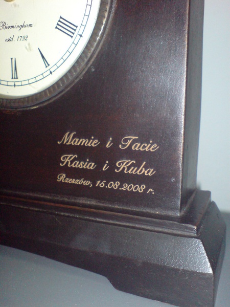 Grawer laserowy wykonany jest na drewnianej obudowie lub szklanych drzwiczkach zegara.