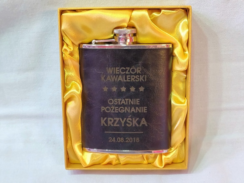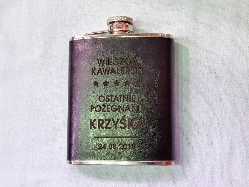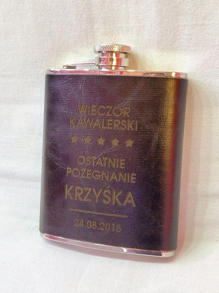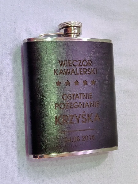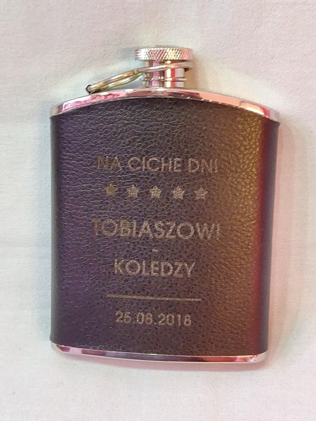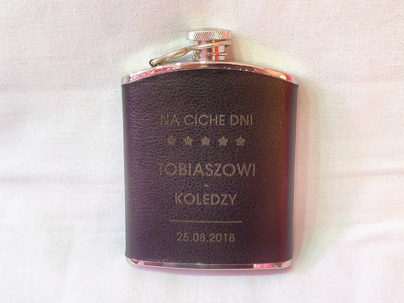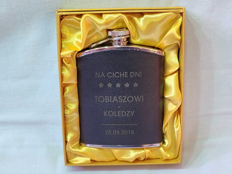 Usługa grawerowania pamiątkowej stalowej piersiówki obciągniętej w ekoskórę.