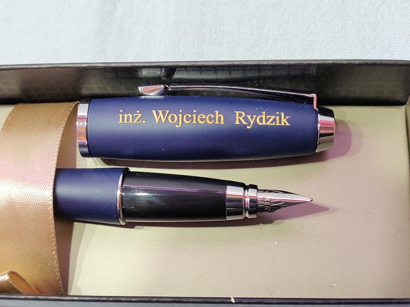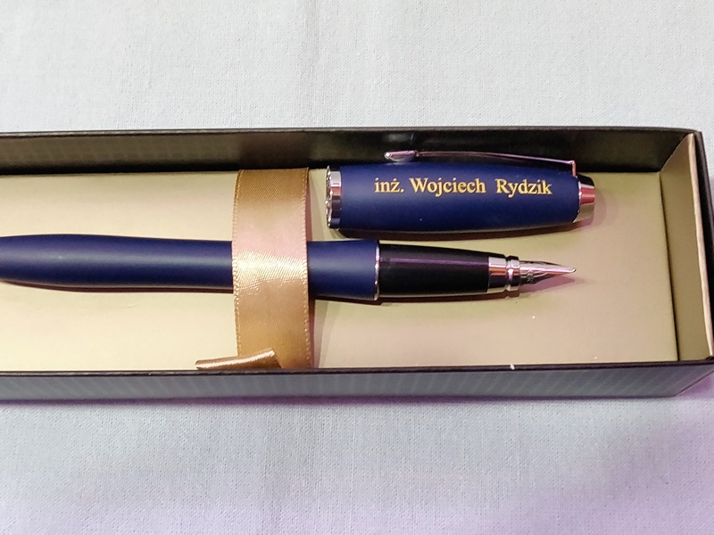 Usługa grawerowania pamiątkowego metalowego granatowego pióra.