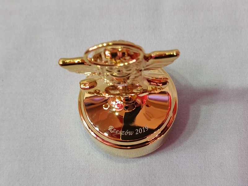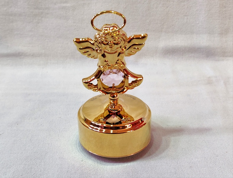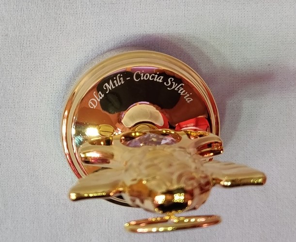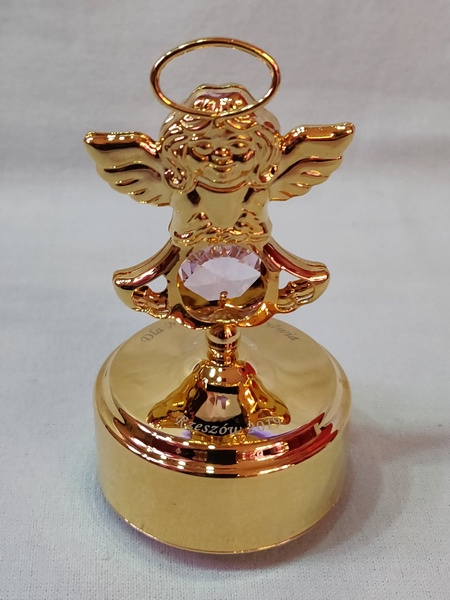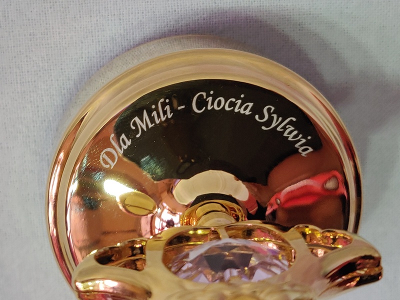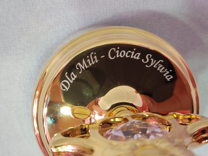 Usługa grawerowania małej mosiądzowanej pozytywki w kształcie dziewczynki z kryształkiem.