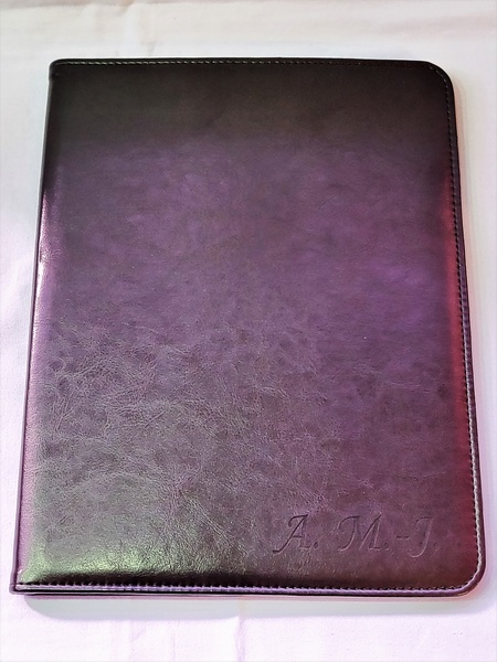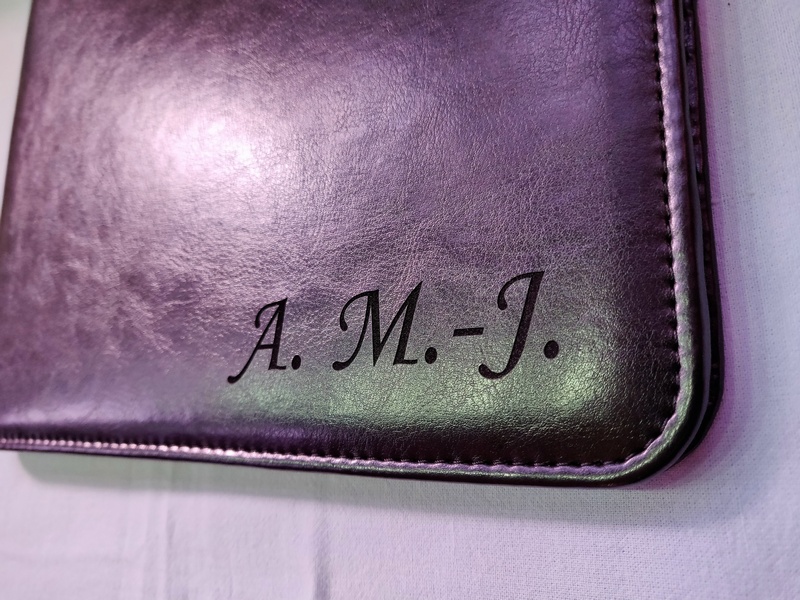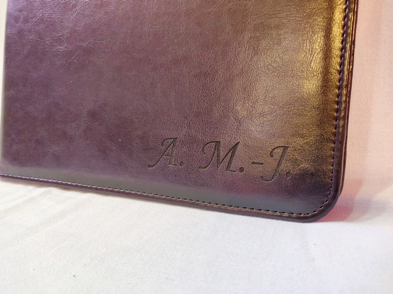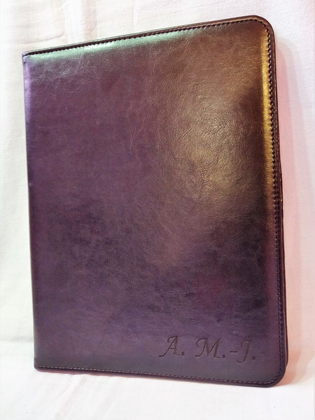 Grawerowane są w tym przypadku inicjały w rogu, na zewnętrznej części teczki.