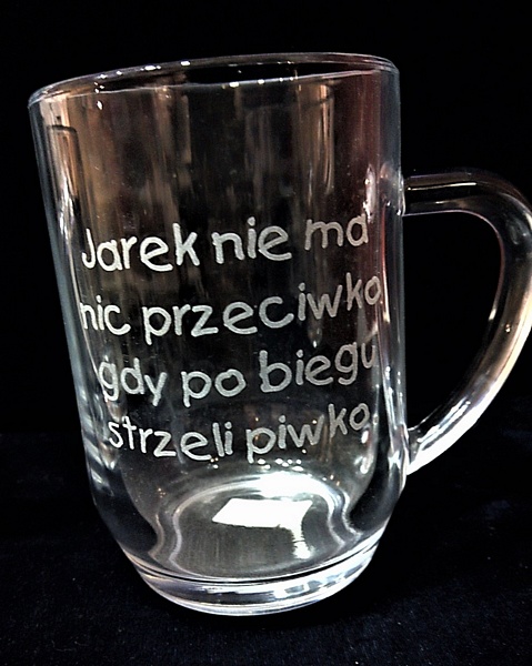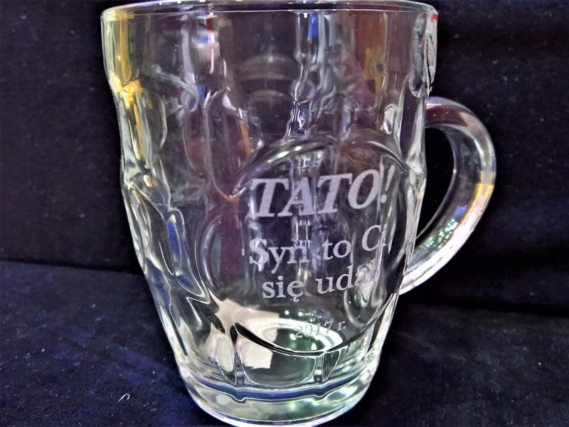 Usługa grawerowania pamiątkowego szklanego kufla.