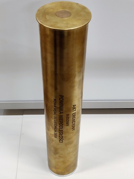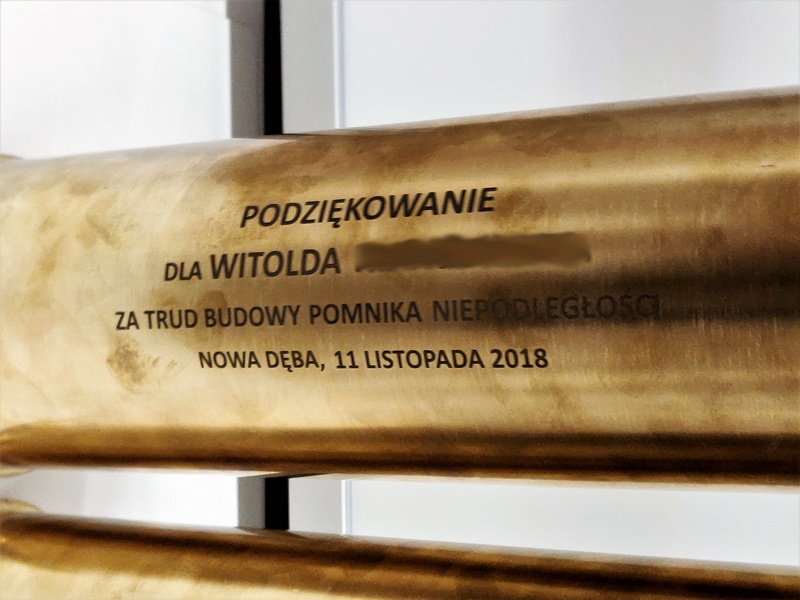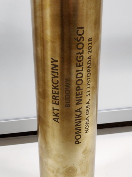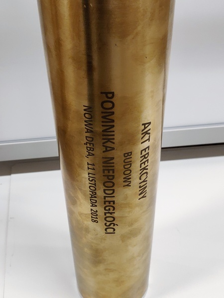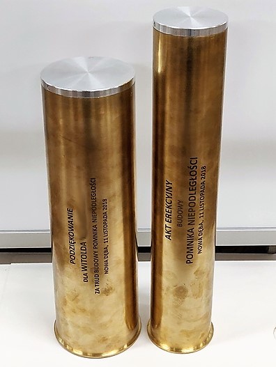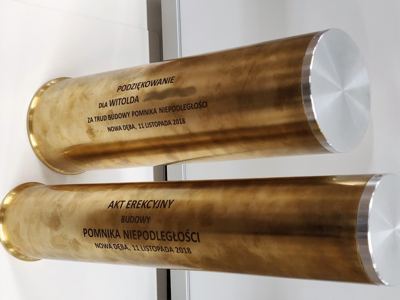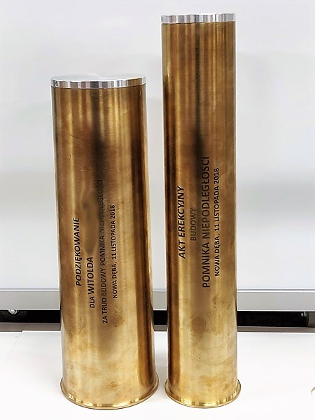 Prezentowana łuska pocisku została przerobiona na pamiątkowy akt erekcyjny oraz podziekowanie.