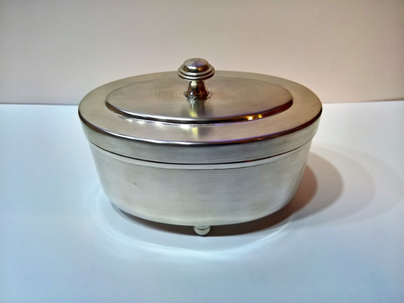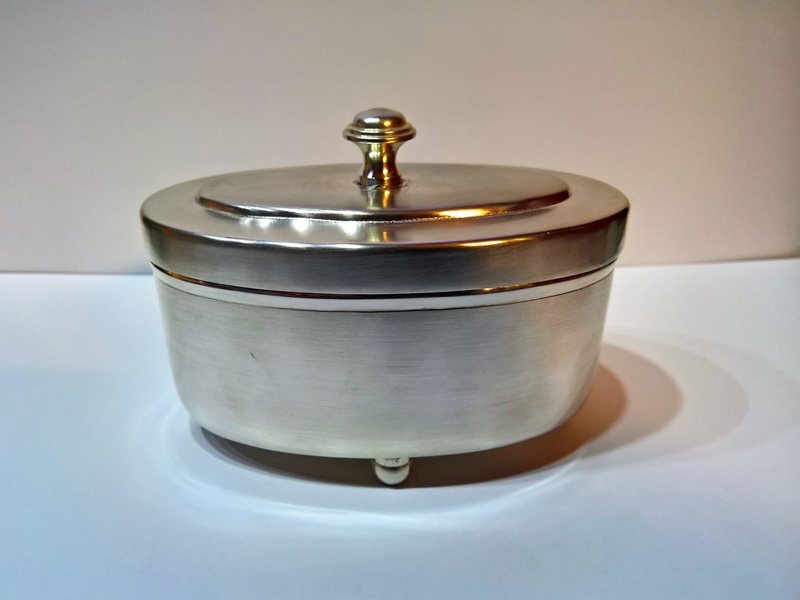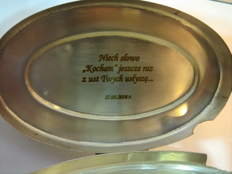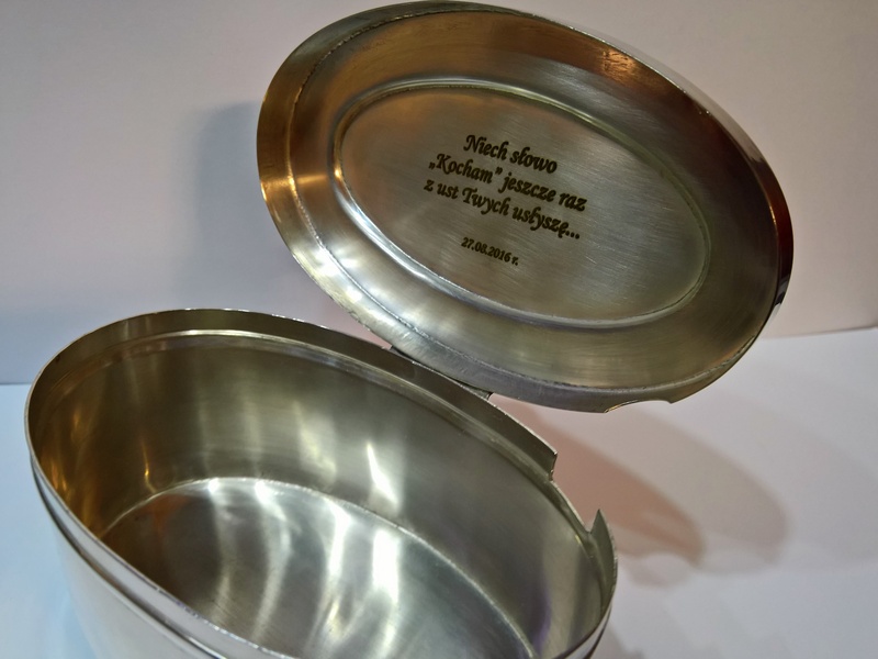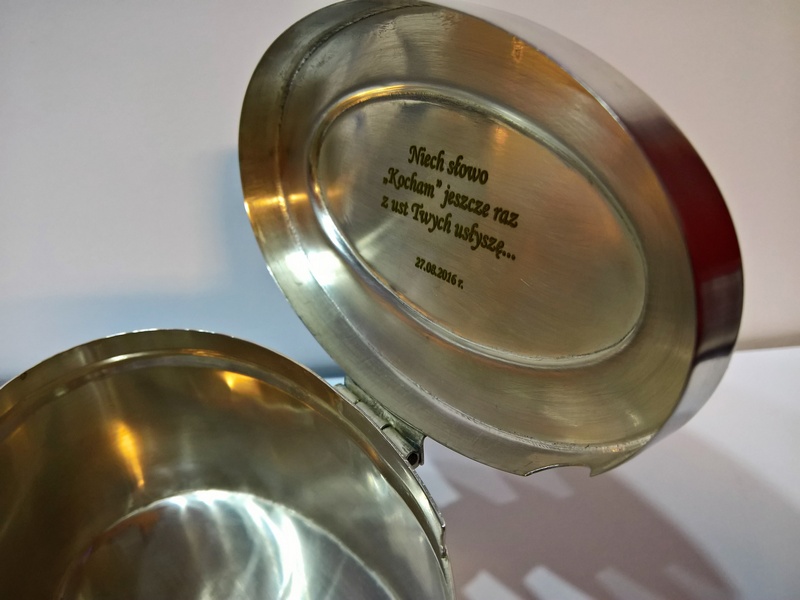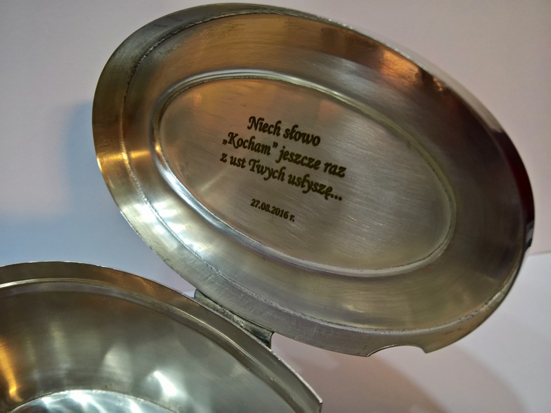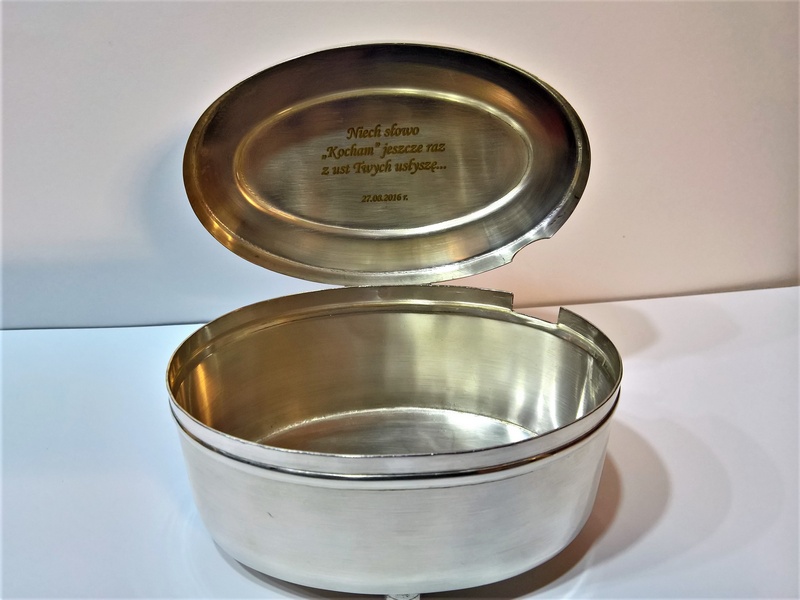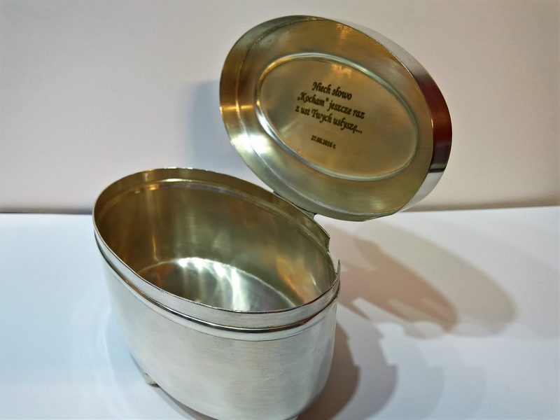 Usługa grawerowania wewnątrz srebrnej cukiernicy.