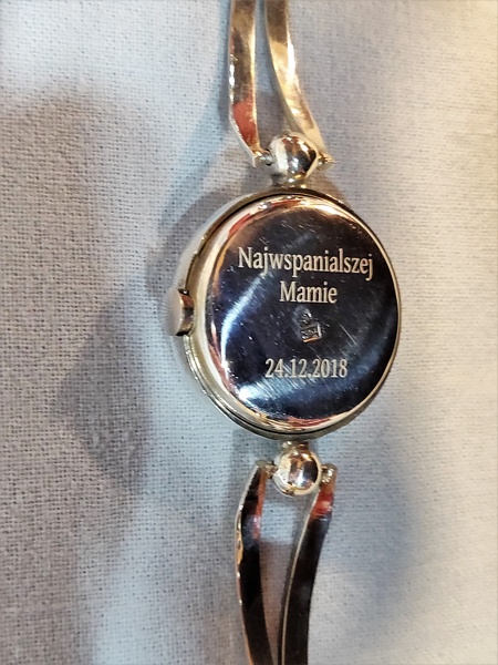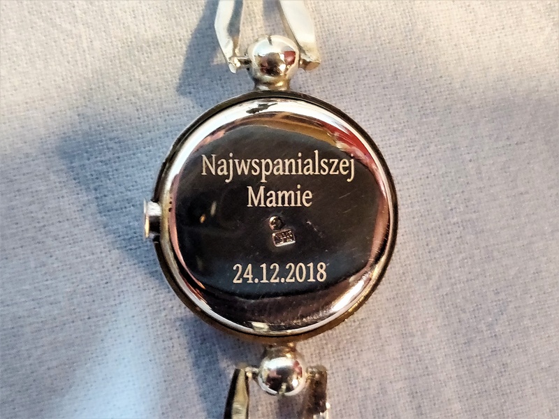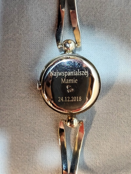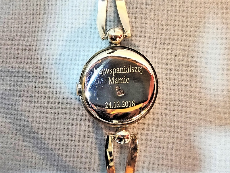 Usługa grawerowania na damskim zegarku biżuteryjnym.