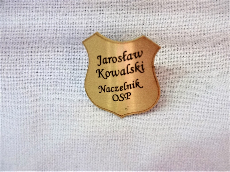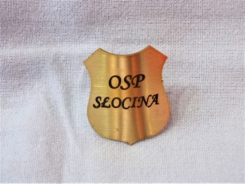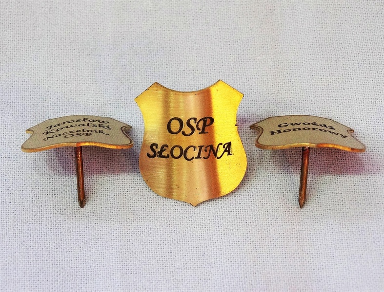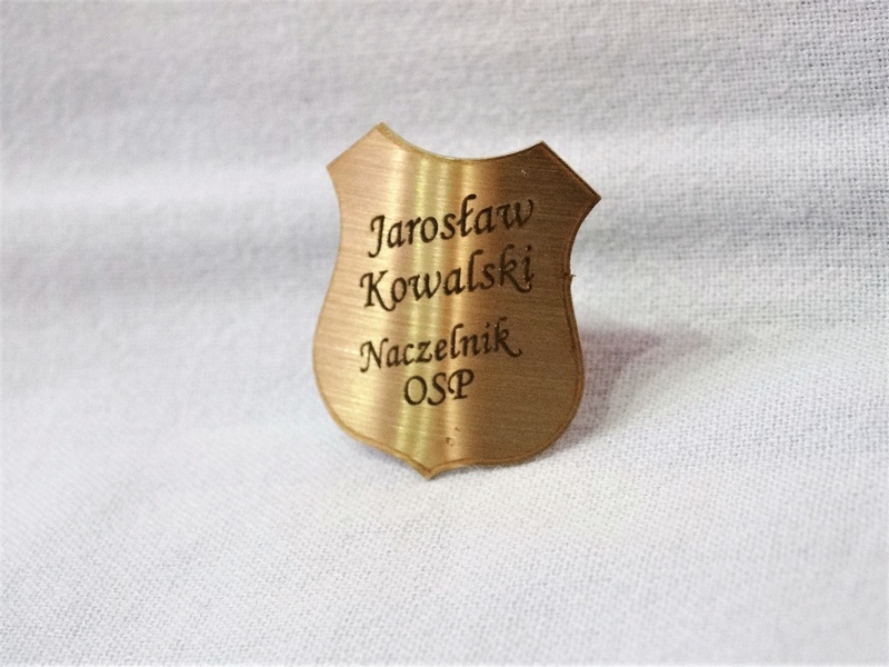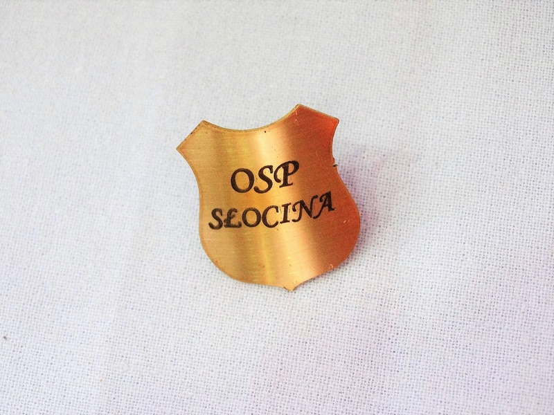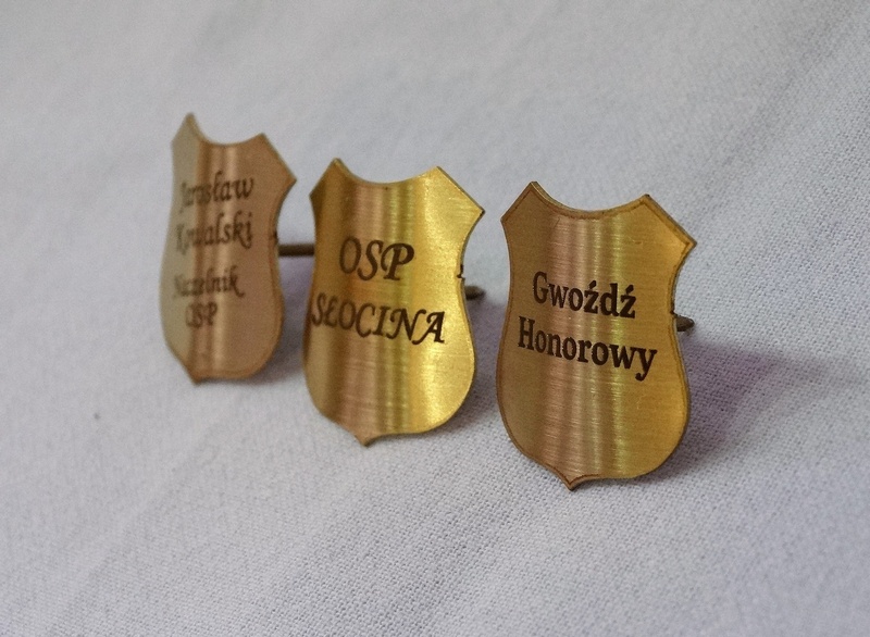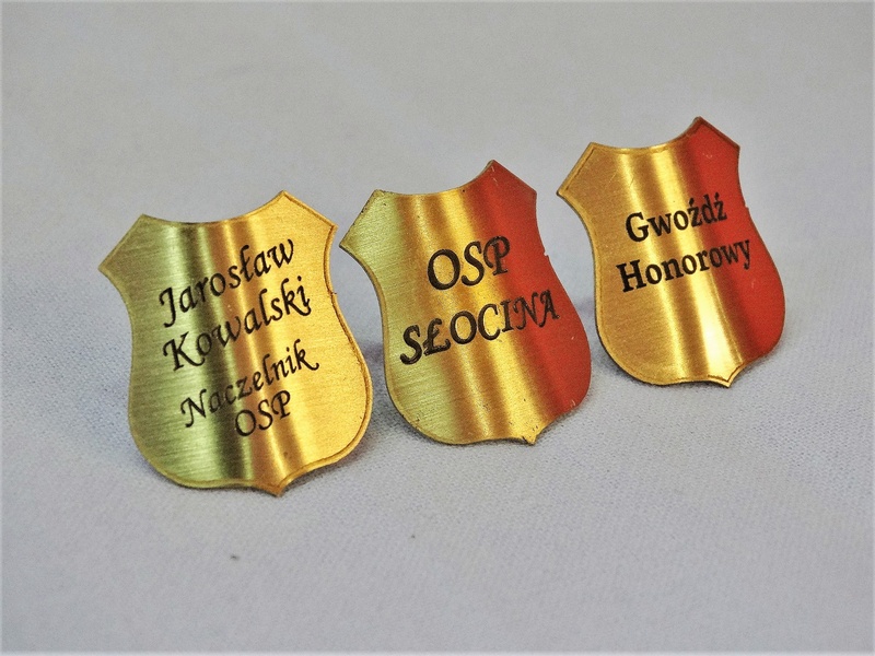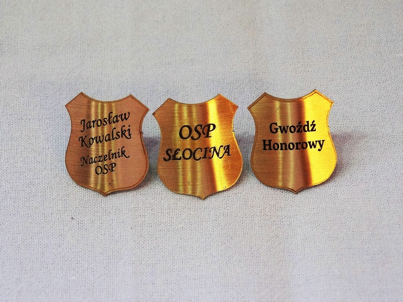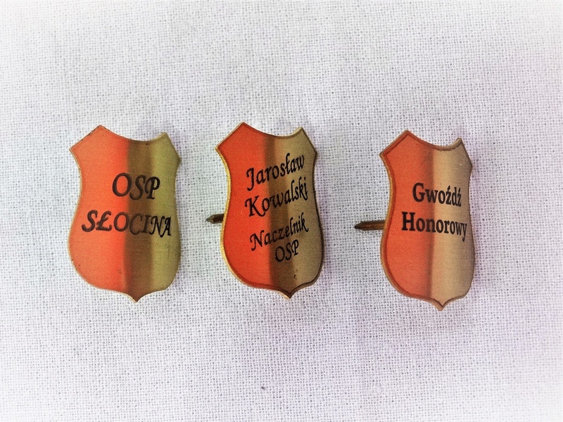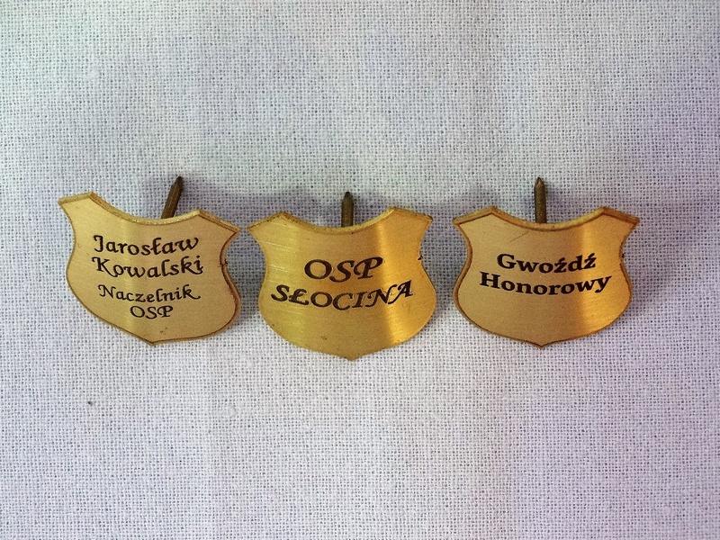 Grawerowana blaszka w kształcie herbu mocowana jest do małego mosiężnego gwoździka za pomocą lutowania.