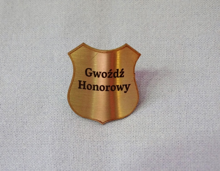 Grawerowany na mosiężnej powierzchni gwoździa napis wypalony jest na czarno.