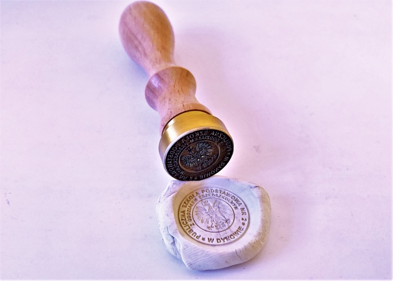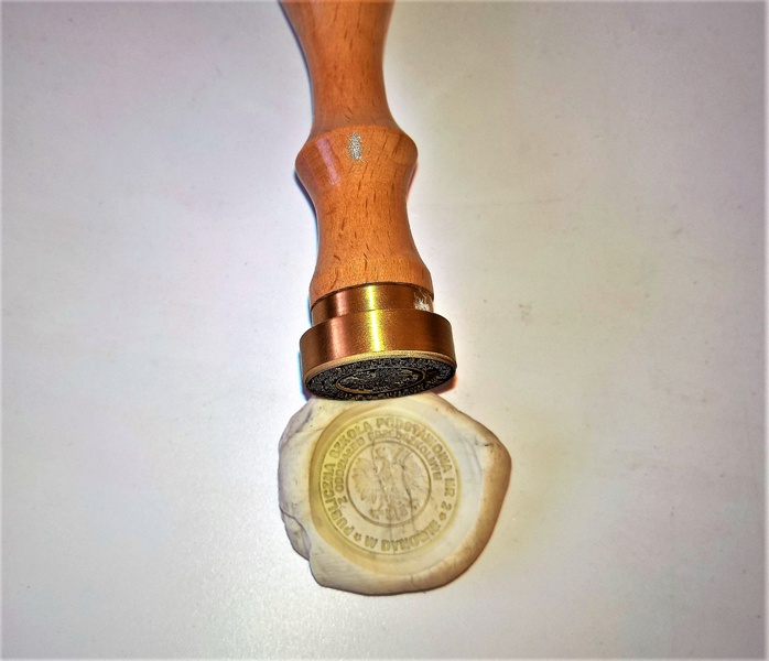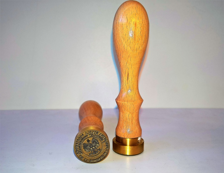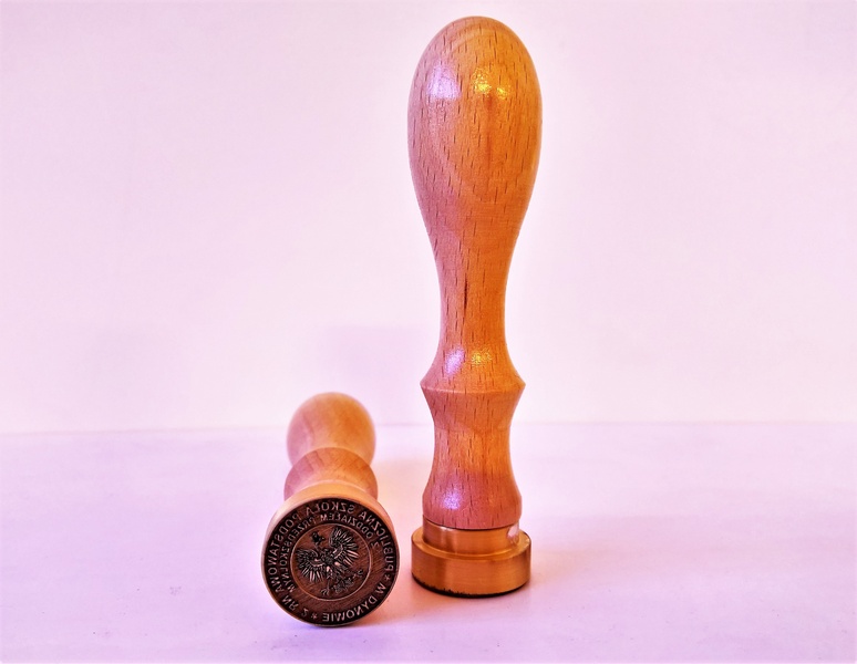 Grawer wykonany jest laserowo w mosiężnym krążku o średnicy 25 mm, mocowanym na drewnianym uchwycie.
