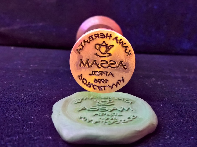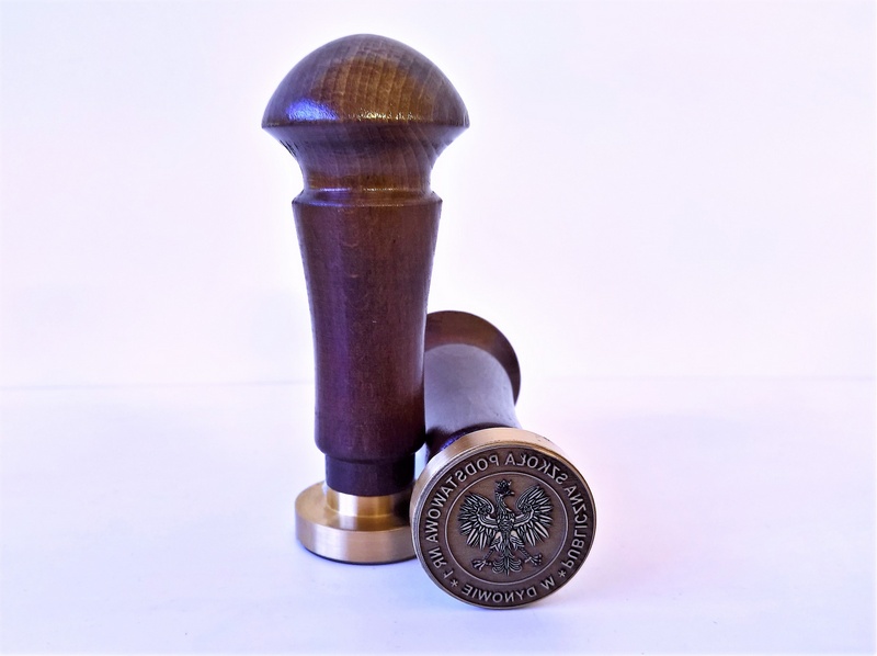 Stempel metalowy okrągły z grawerowanym wgłębnie napisem.
