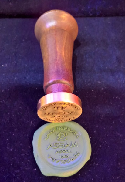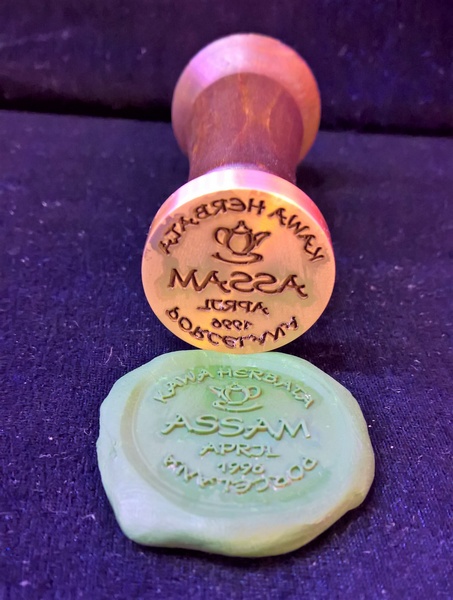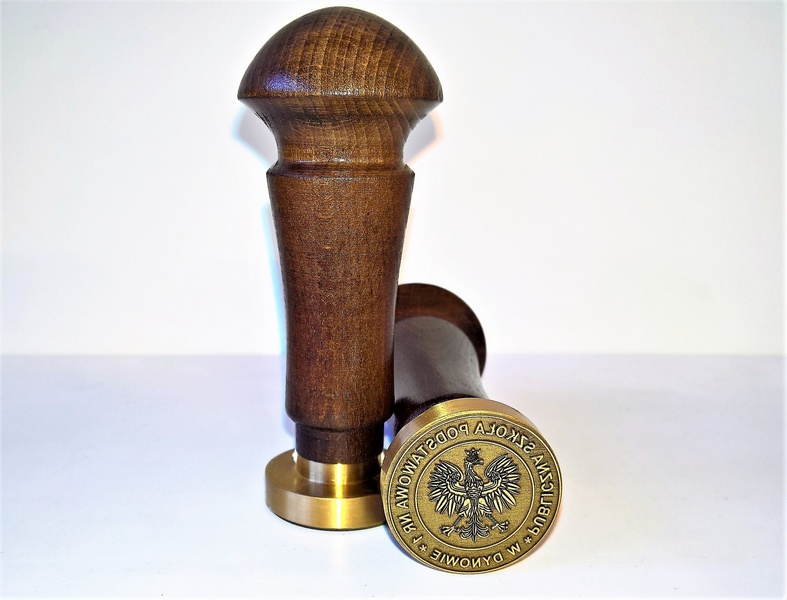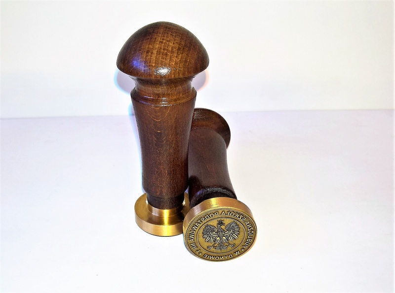 Grawer wykonany jest laserowo w mosiężnym krążku o średnicy 35 mm, mocowanym na drewnianym uchwycie.