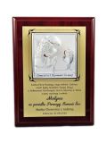 Pamiątka Komunii dla dziewczynki - srebrny obrazek 6568/1XA na złotej tabliczce i wiśniowym podkładzie