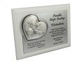 Pamiątka Chrztu Św. - srebrny obrazek z Aniołkiem w sercu na białym podkładzie