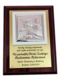 Pamiątka Chrztu Św. - obrazek Aniołka na złotym laminacie z grawerem na wiśniowym podkładzie