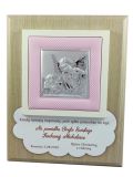 Pamiątka Chrztu Św. dla dziewczynki - srebrny Aniołek na materiale z grawerem na jasnym podkładzie
