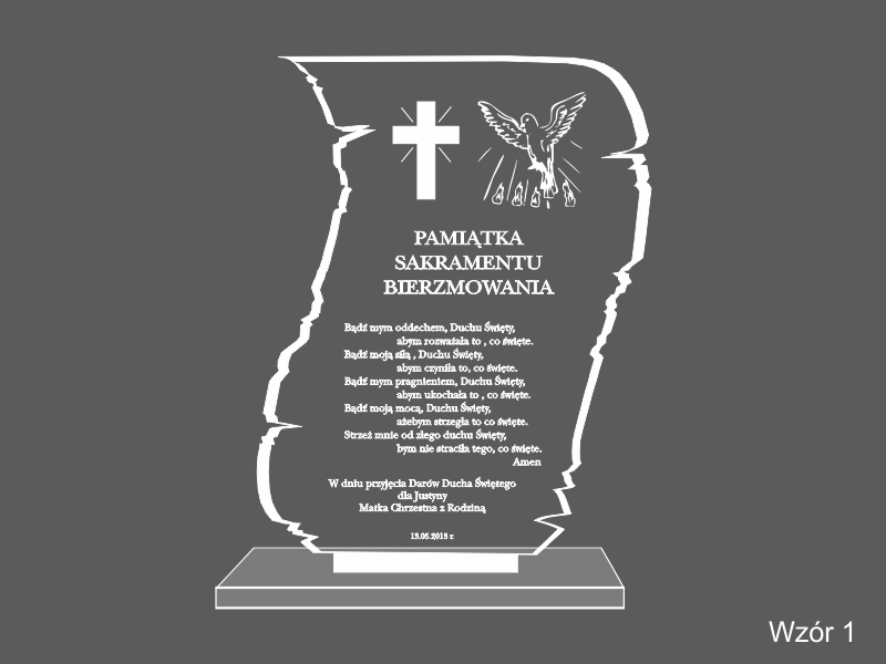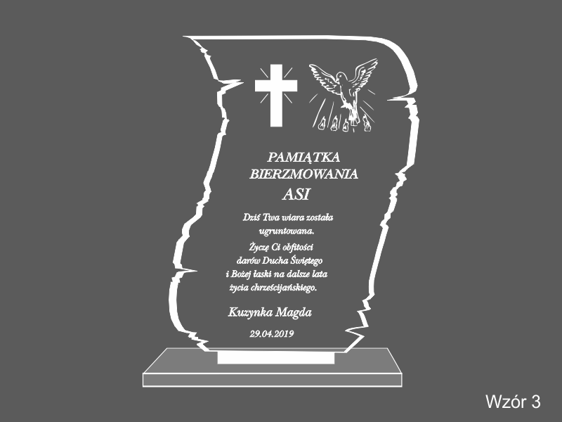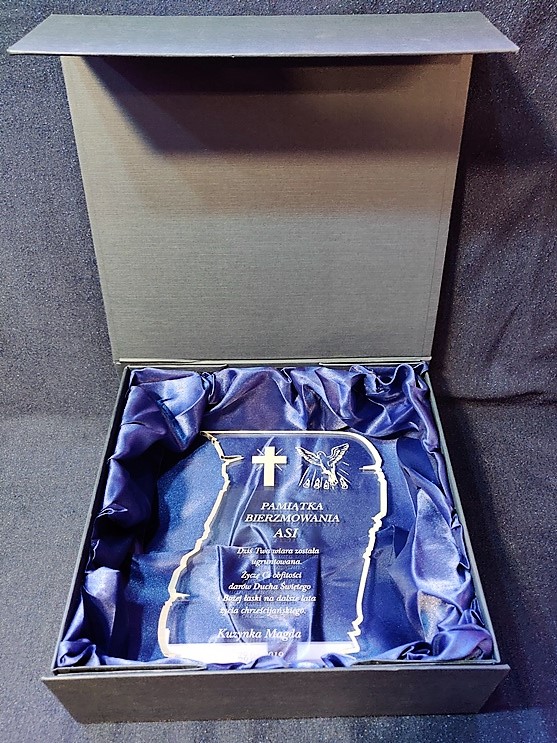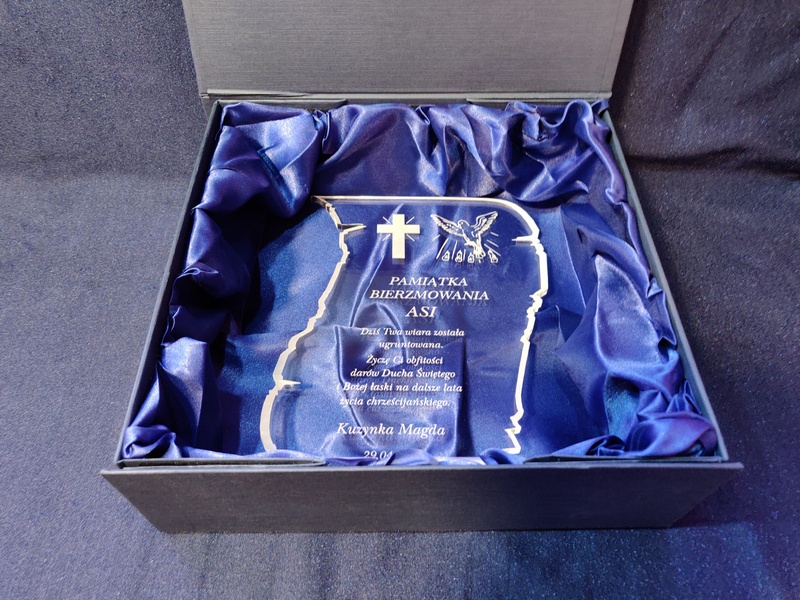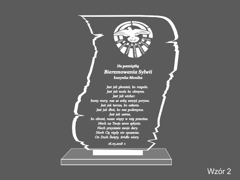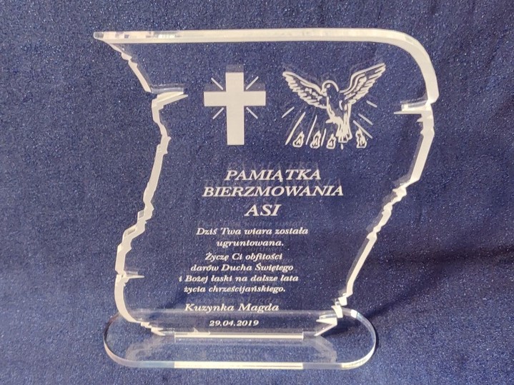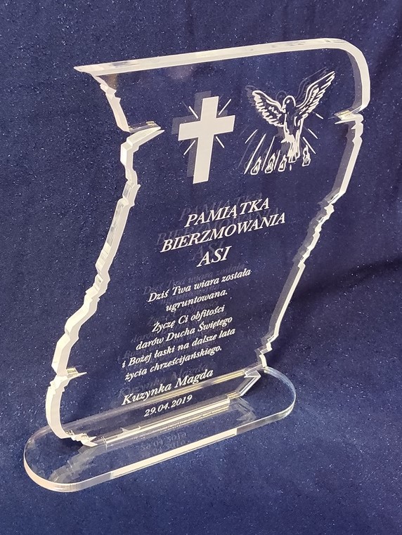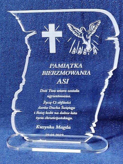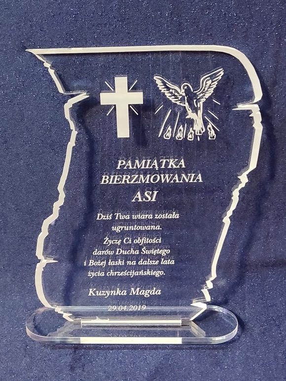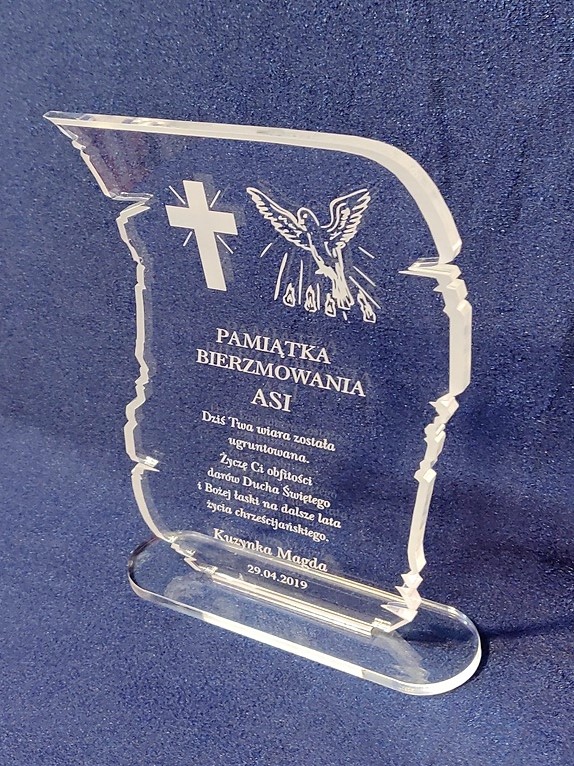 Pamiątkowa statuetka w formie zwoju z okazji przyjęcia Sakramentu Bierzmowania wykonana z bezbarwnej pleksi, z grawerem.