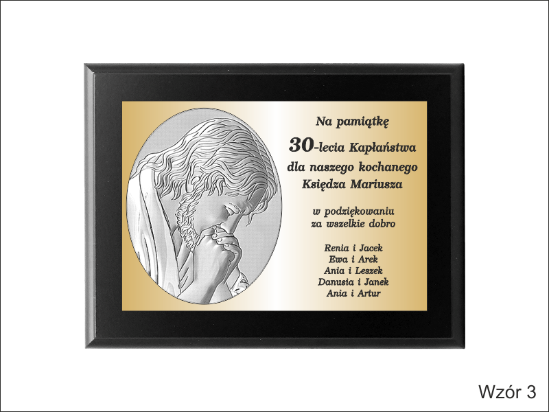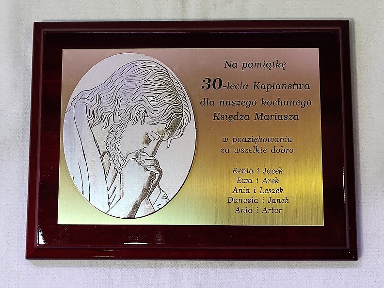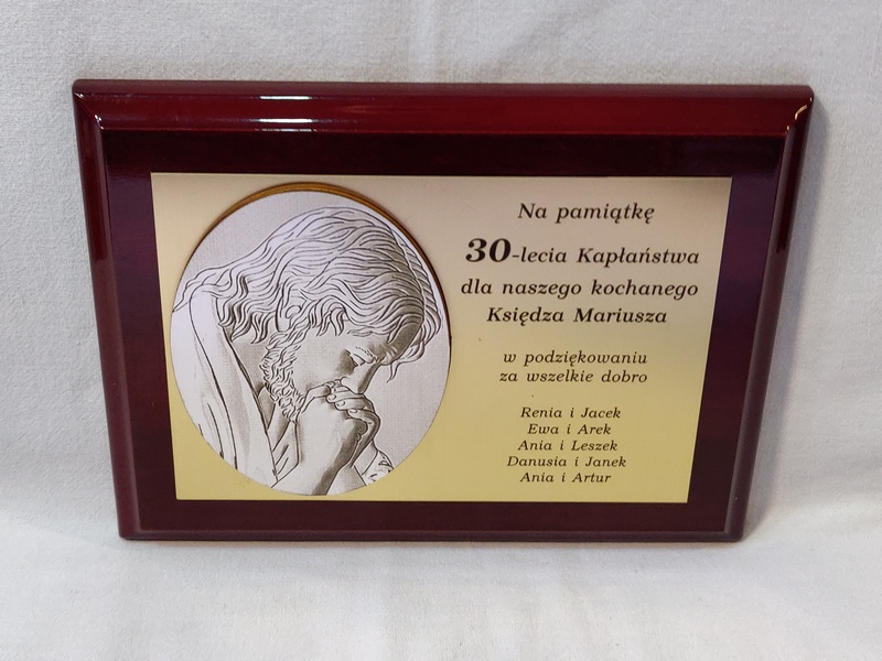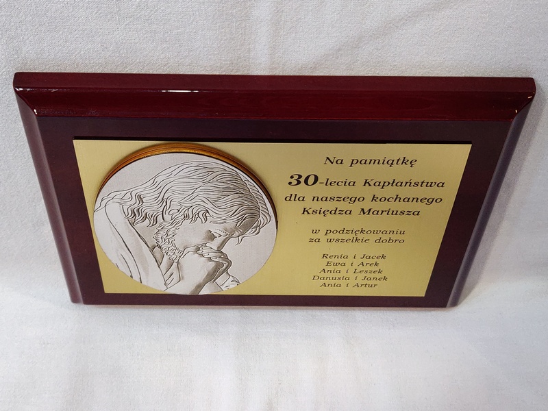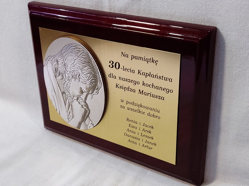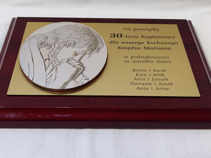 - z laminatu z wygrawerowaną dedykacją i wyciętym miejscem na wizerunek,
