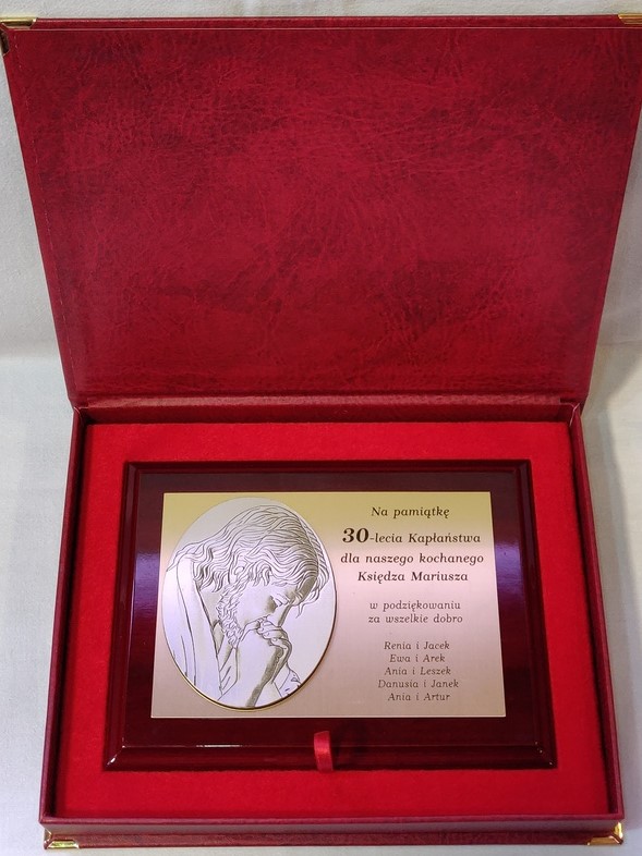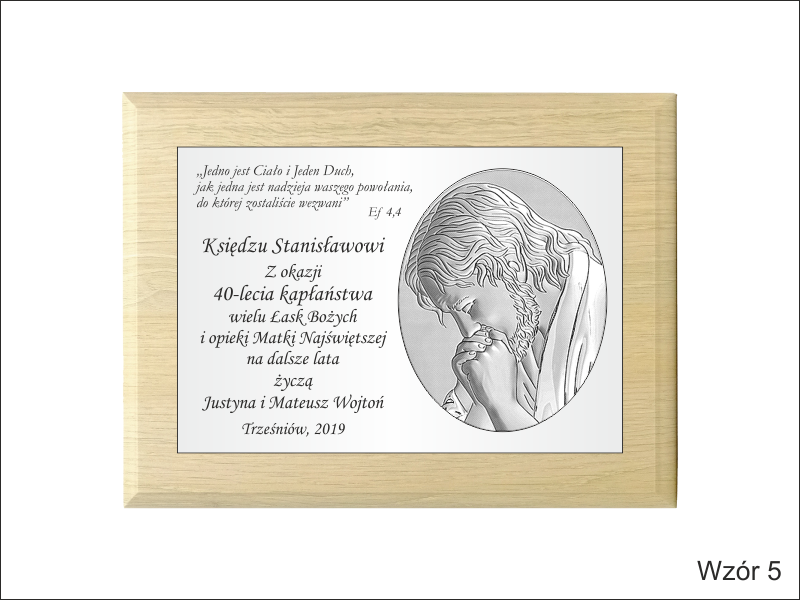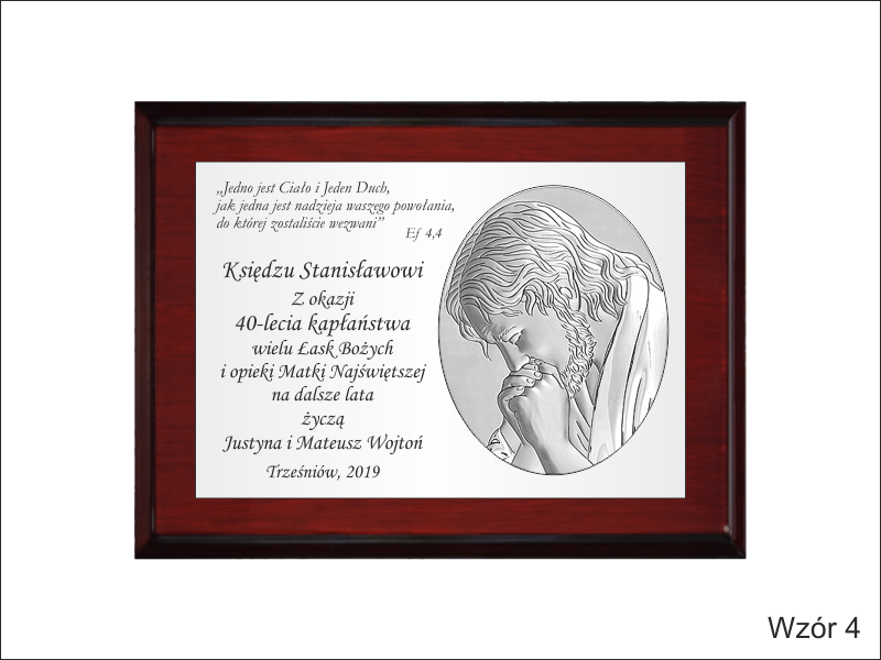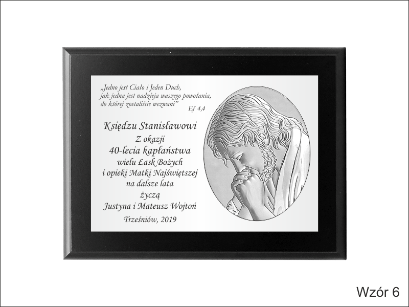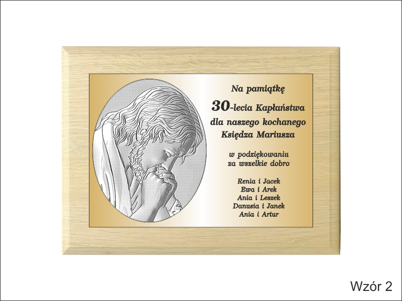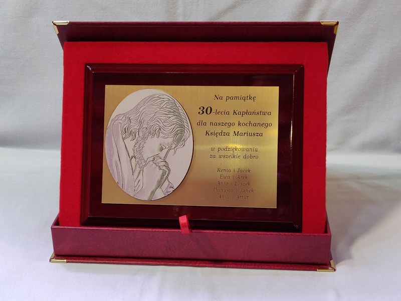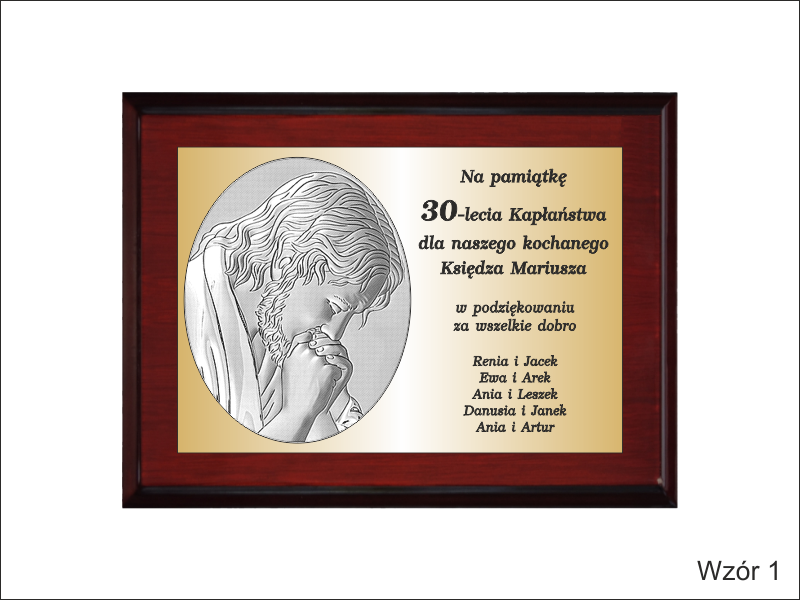 - z laminatu z wygrawerowaną dedykacją i wyciętym miejscem na wizerunek,