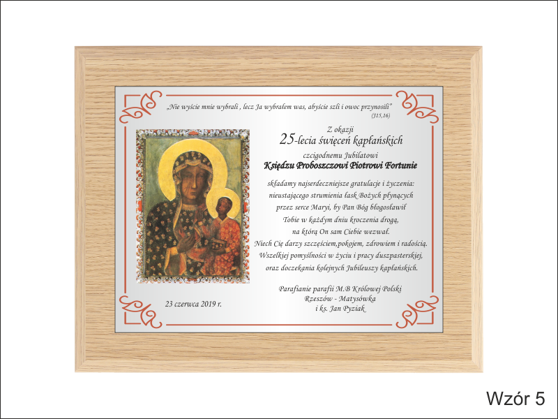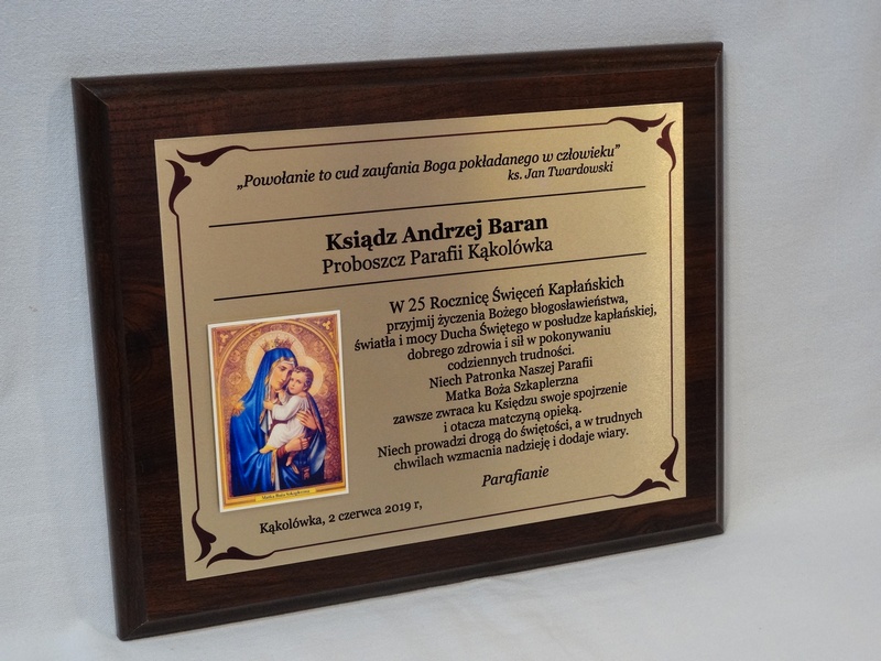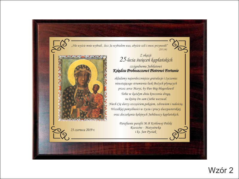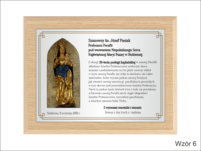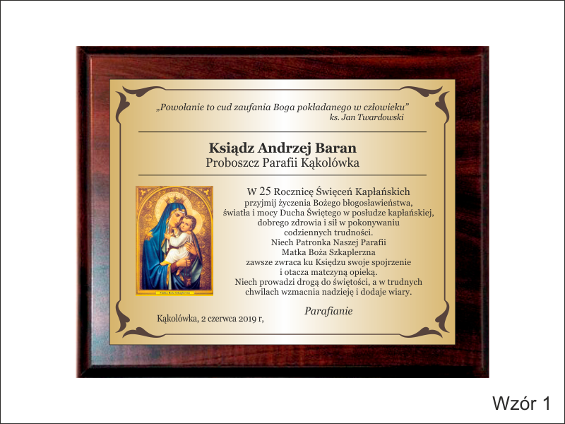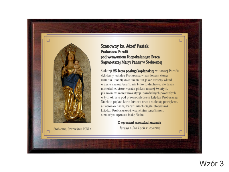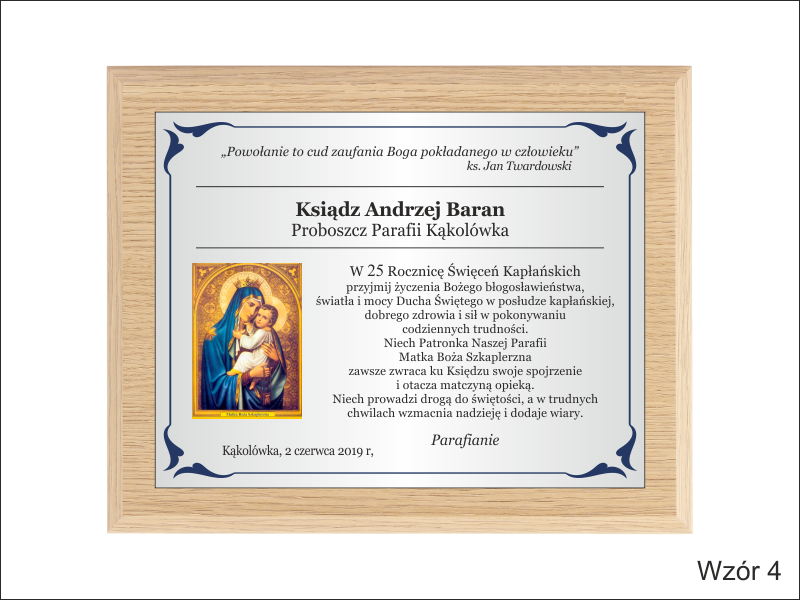 - z dwóch blach w różnych odcieniach z nadrukowaną dedykacją oraz ozdobną grafiką Matki Bożej,