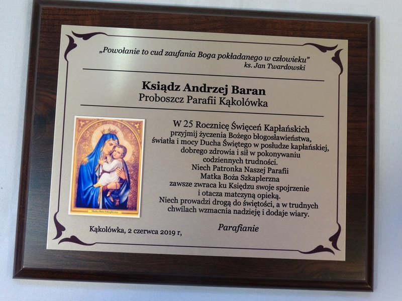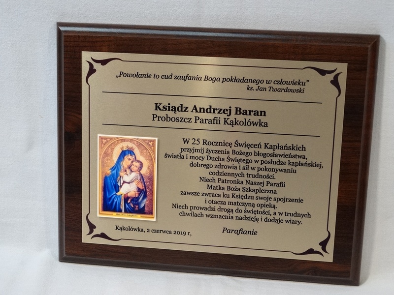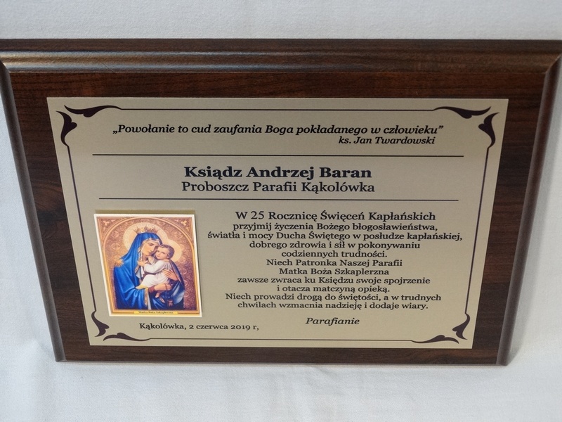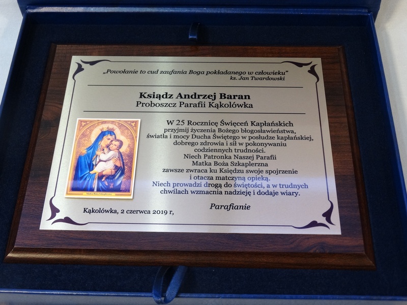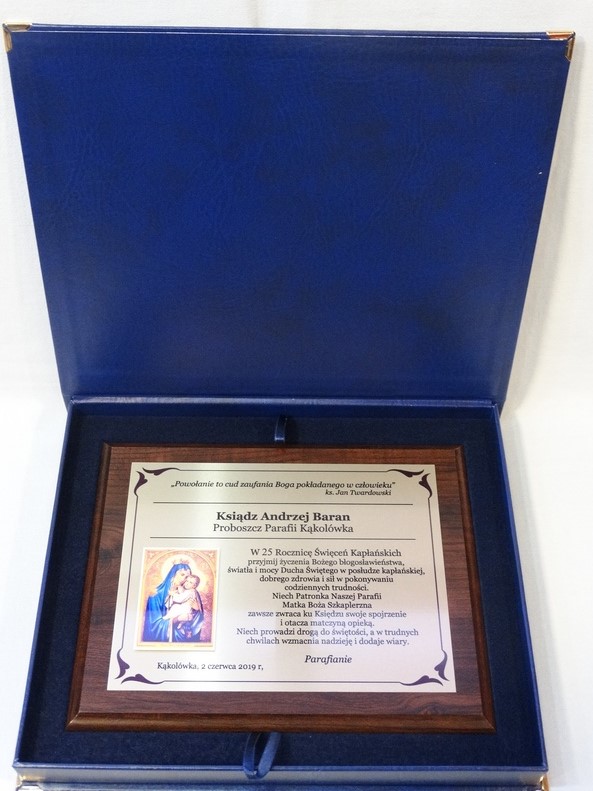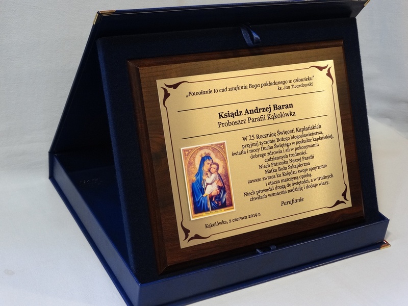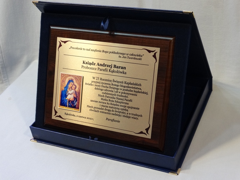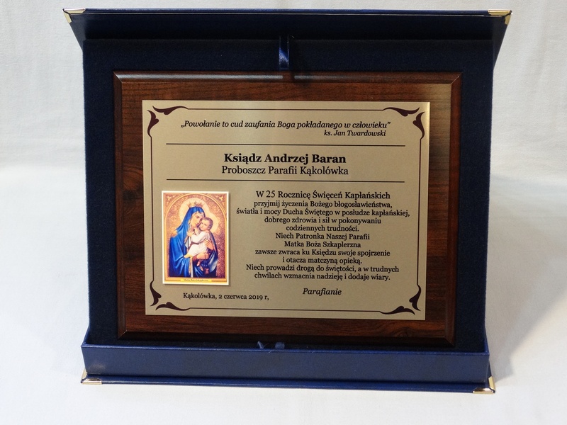 Pamiątka z okazji jubileuszu święceń kapłańskich w postaci okolicznościowego złożonego dyplomu drewnianego.