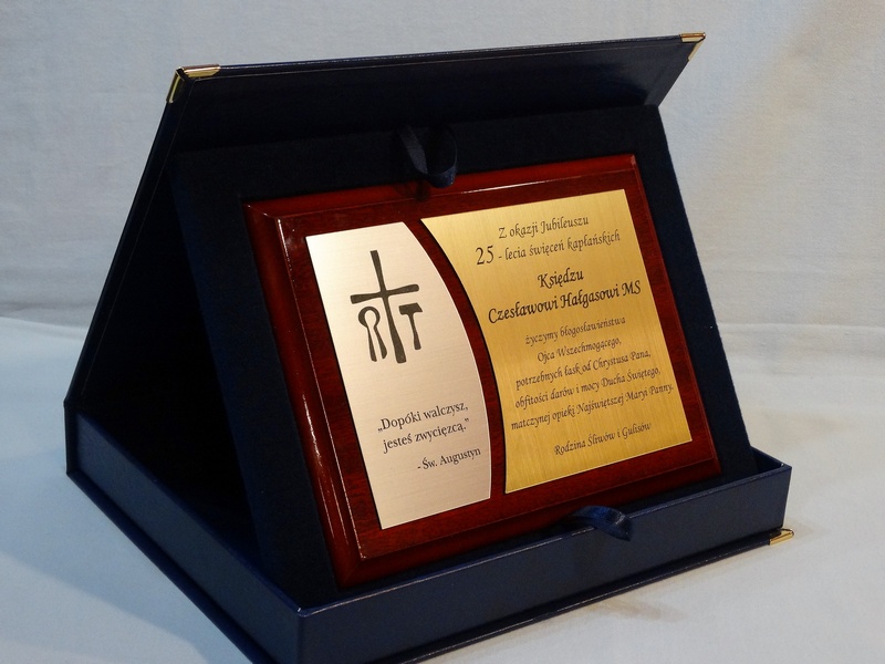 - z laminatów w dwóch odcieniach z wygrawerowaną dedykacją i ozdobną grafiką,