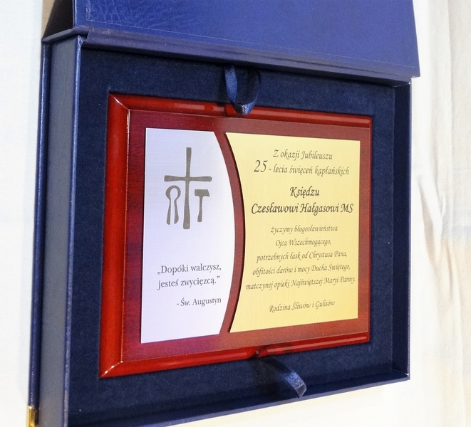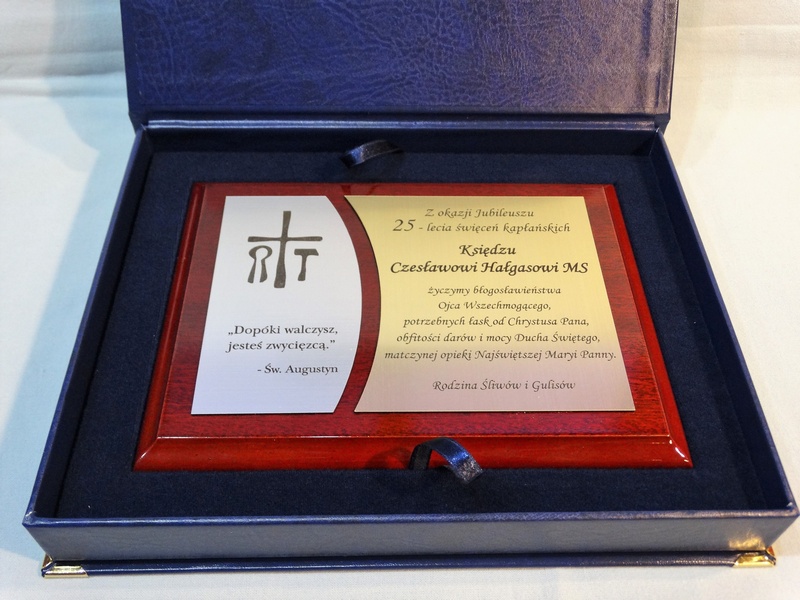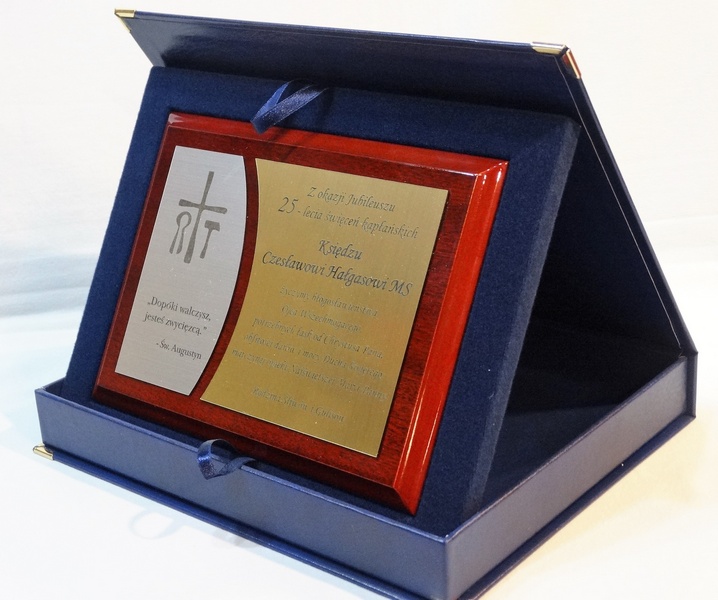Pamiątkowy upominek z okazji jubileuszu święceń kapłańskich w postaci okolicznościowego złożonego dyplomu drewnianego.