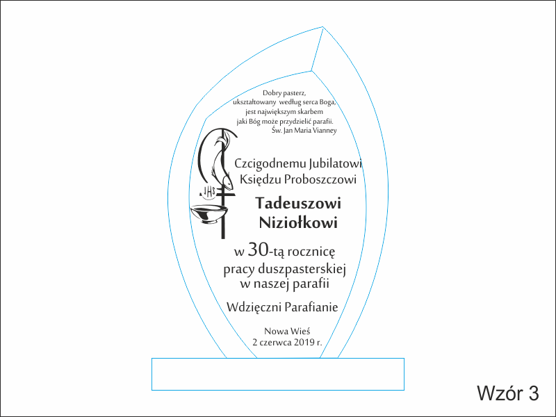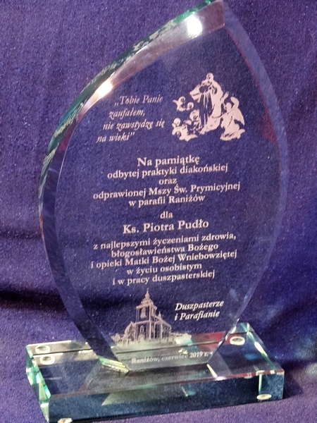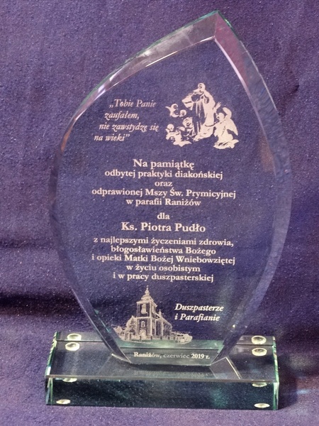 Pamiątkę z grawerem na jubileusz kapłaństwa można także wykonać na innych modelach statuetek szklanych.