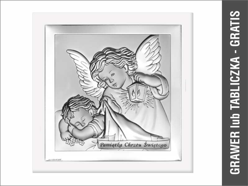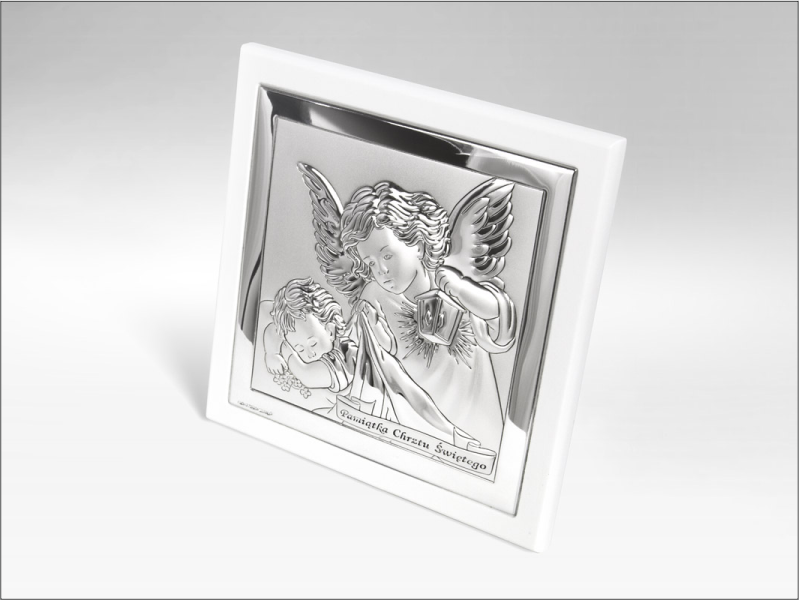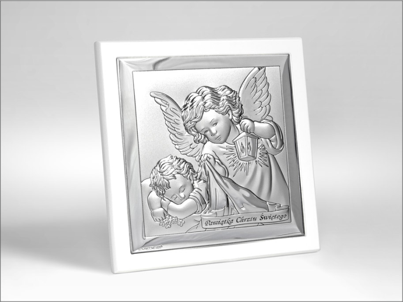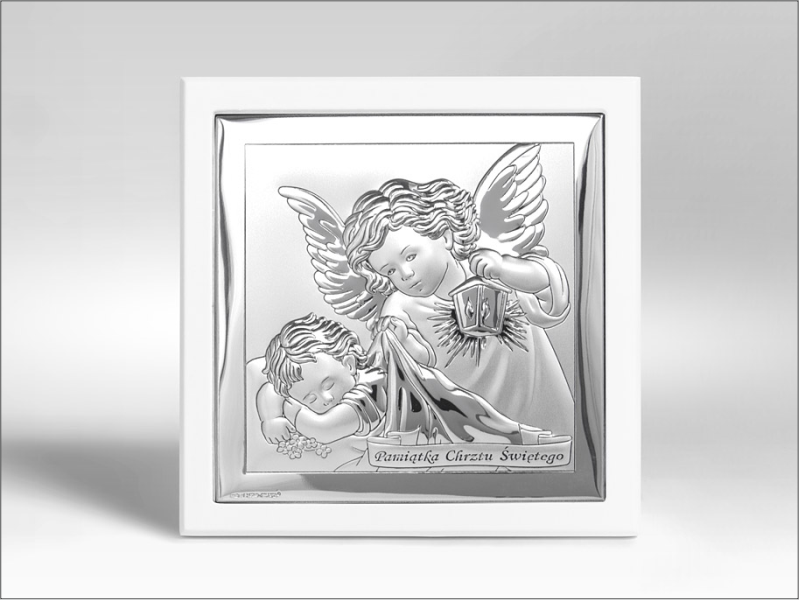 Srebrny Obrazek "Aniołek z latarenką z podpisem na białym drewnie 6430W kwadratowy".