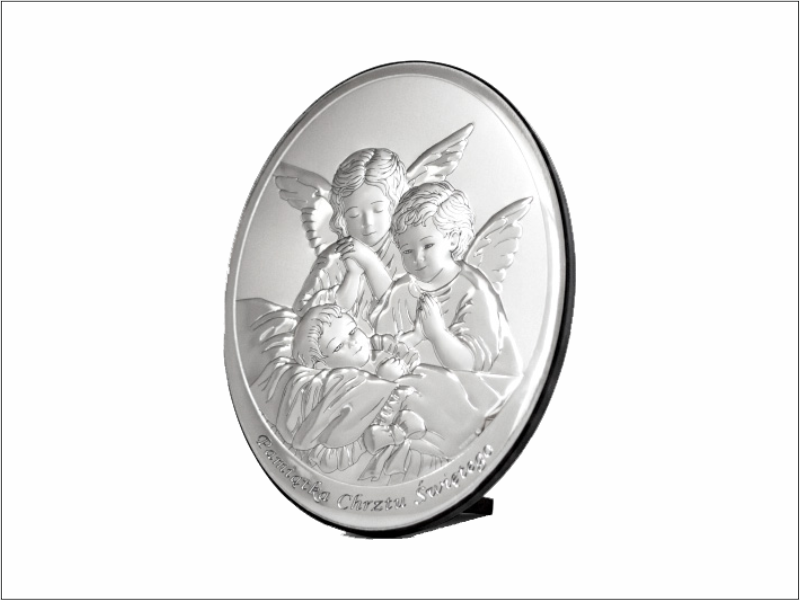 - obrazek srebrny przedstawiający Aniołki nad dzieckiem