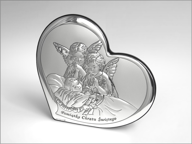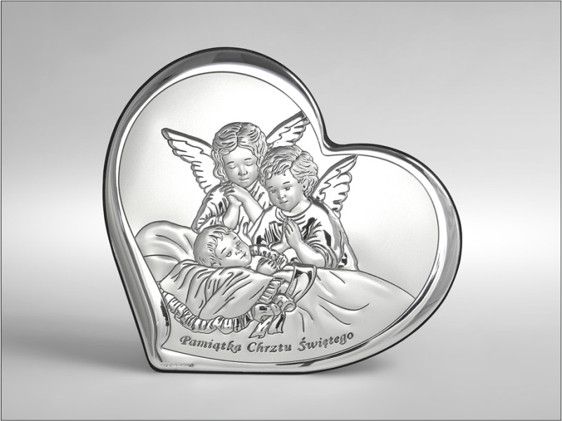 - obrazek srebrny w kształcie serca przedstawiający Aniołki nad dzieckiem