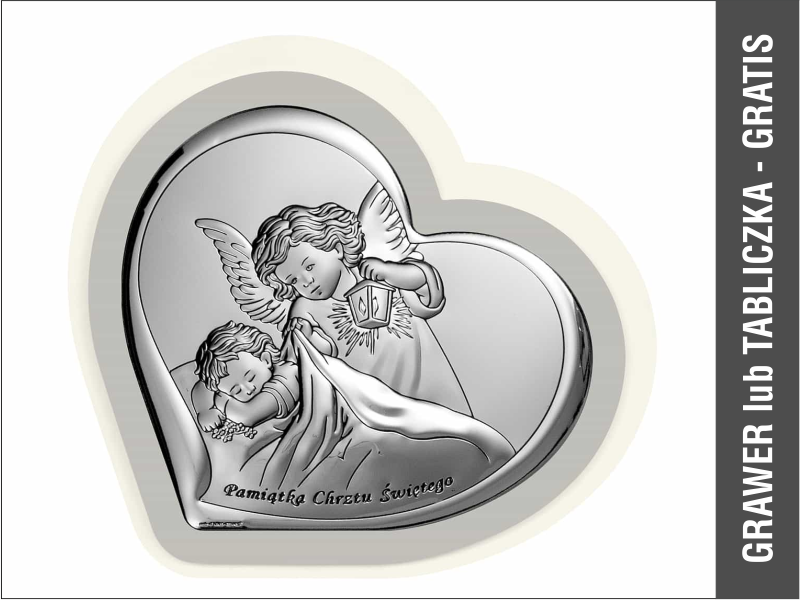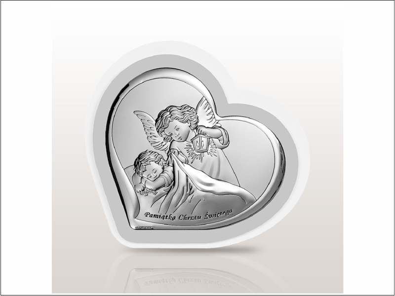 - obrazek srebrny w kształcie serca przedstawiający Aniołka z latarenką nad dzieckiem