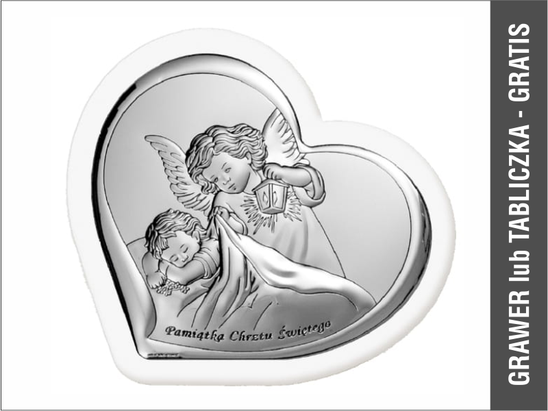 - obrazek srebrny w kształcie serca przedstawiający Aniołka z latarenką nad dzieckiem