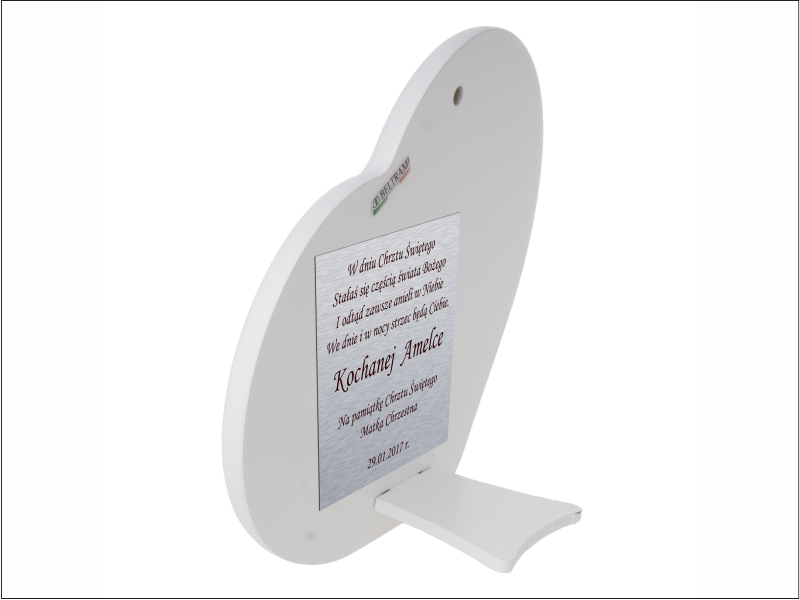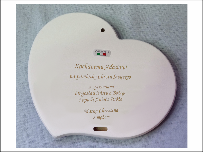 Obrazek ma kształt serca i umieszczony jest na białym drewnie. Na obrazku wytłoczony jest napis "Pamiątka Chrztu Świętego"
