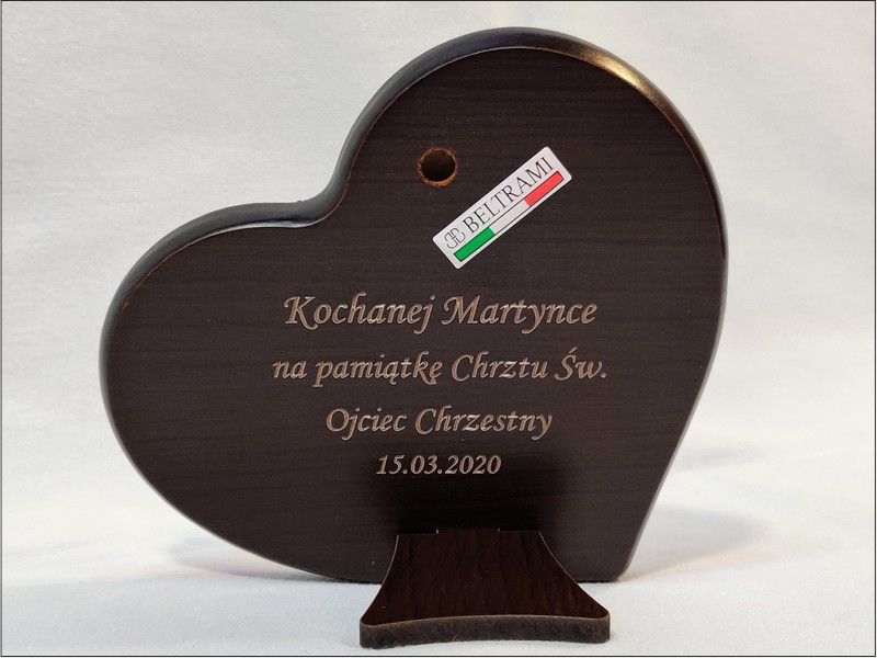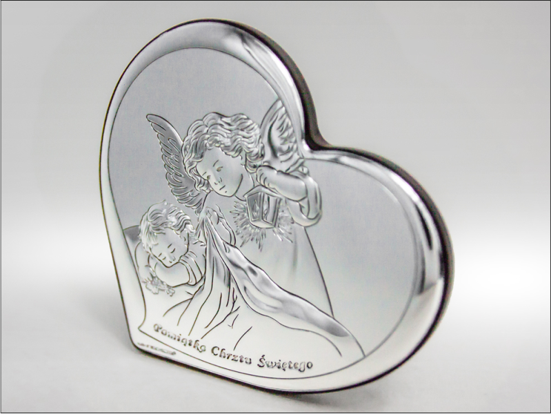 Obrazek ma kształt serca, a w dolnej części wytłoczony jest podpis "Pamiątka Chrztu Świętego".