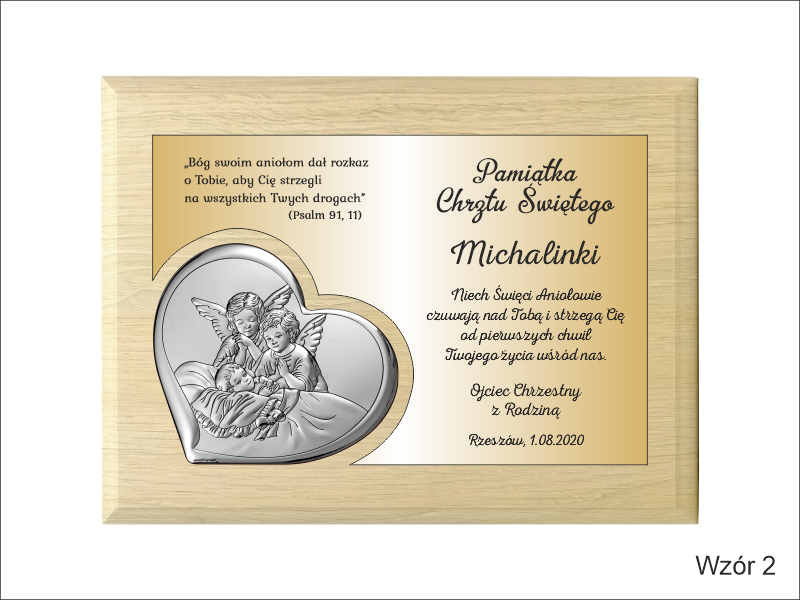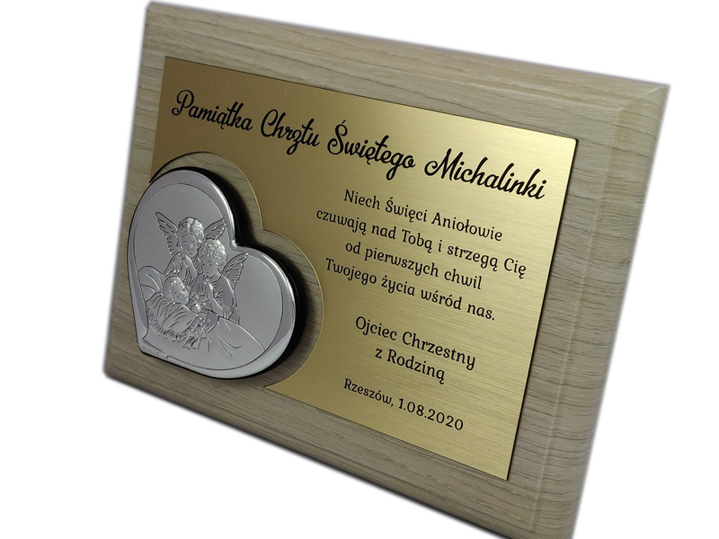 Dedykacja z okazji chrztu jest wygrawerowana w złotym laminacie, w którym wycięte jest także miejsce na srebrny obrazek.