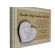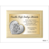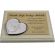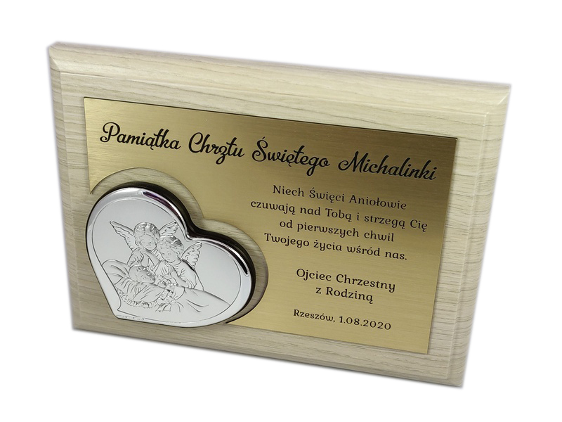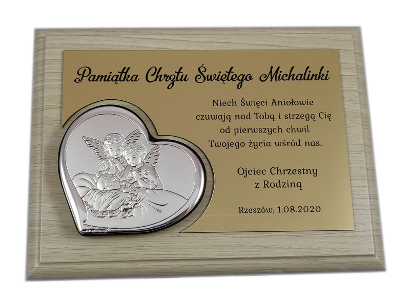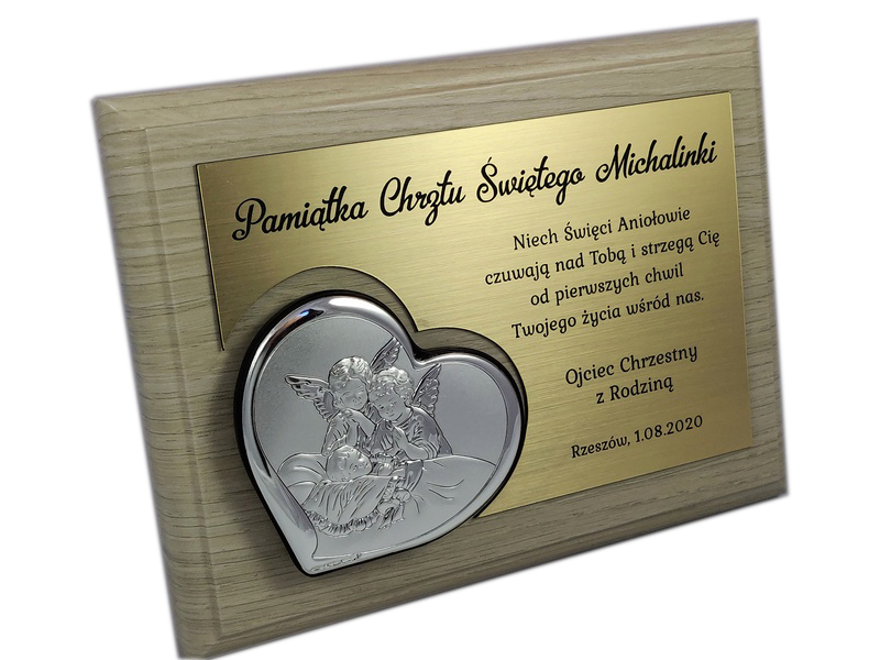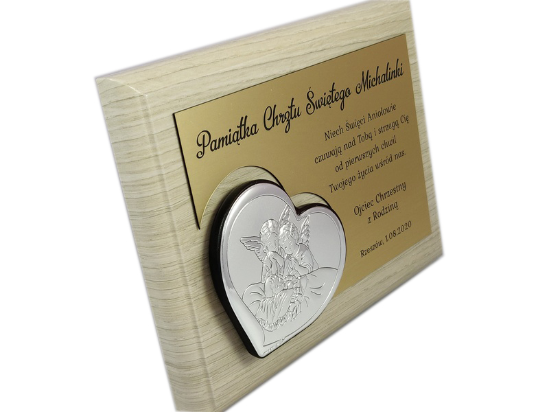 Pamiątka Chrztu Świętego i zarazem wyjątkowy upominek - srebrny obrazek z aniołkami w sercu na jasnym drewnianym podkładzie i złotą tabliczką.