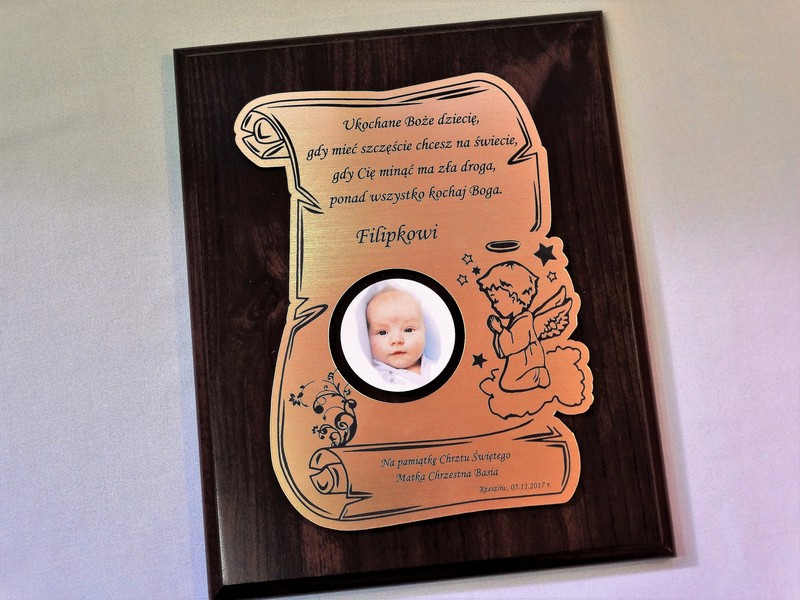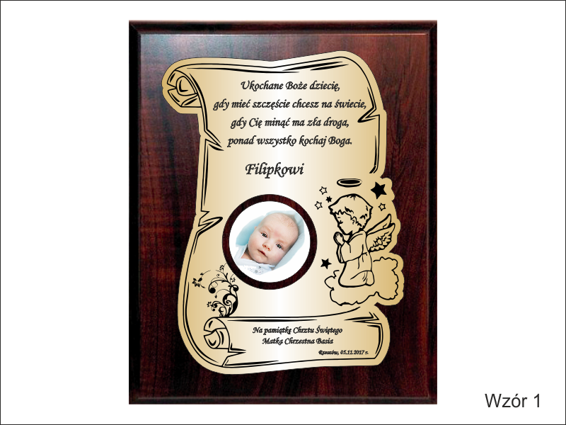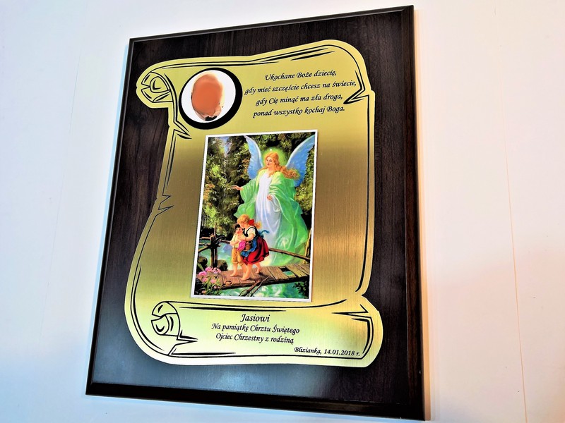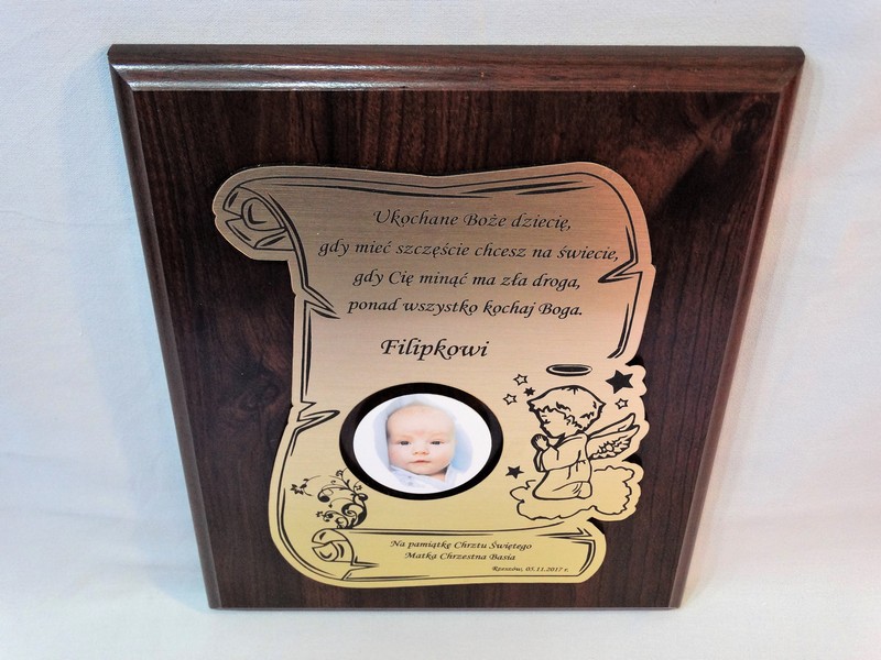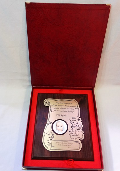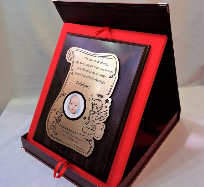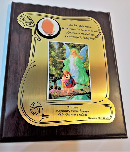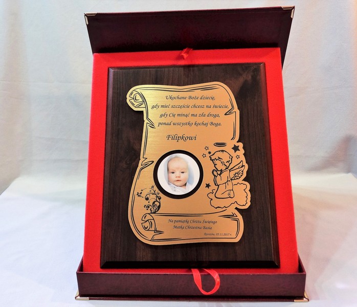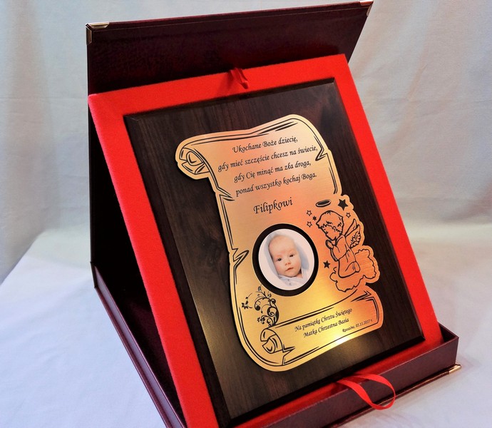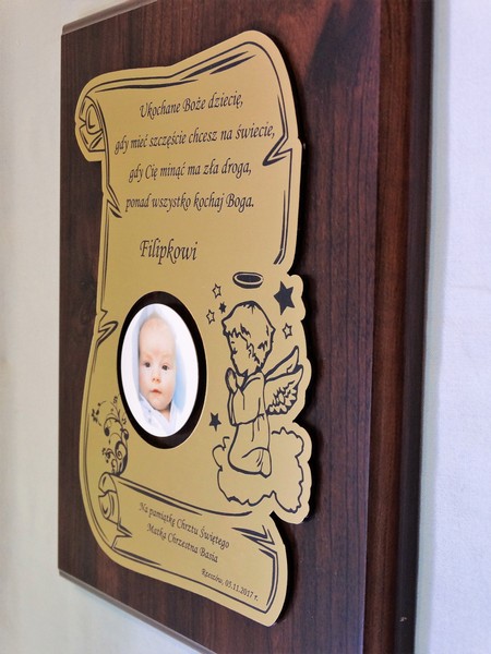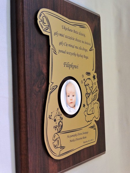 Pamiątka Chrztu Świętego w postaci dyplomu okolicznościowego na drewnianym podkładzie z grawerowanym złotym laminatem.